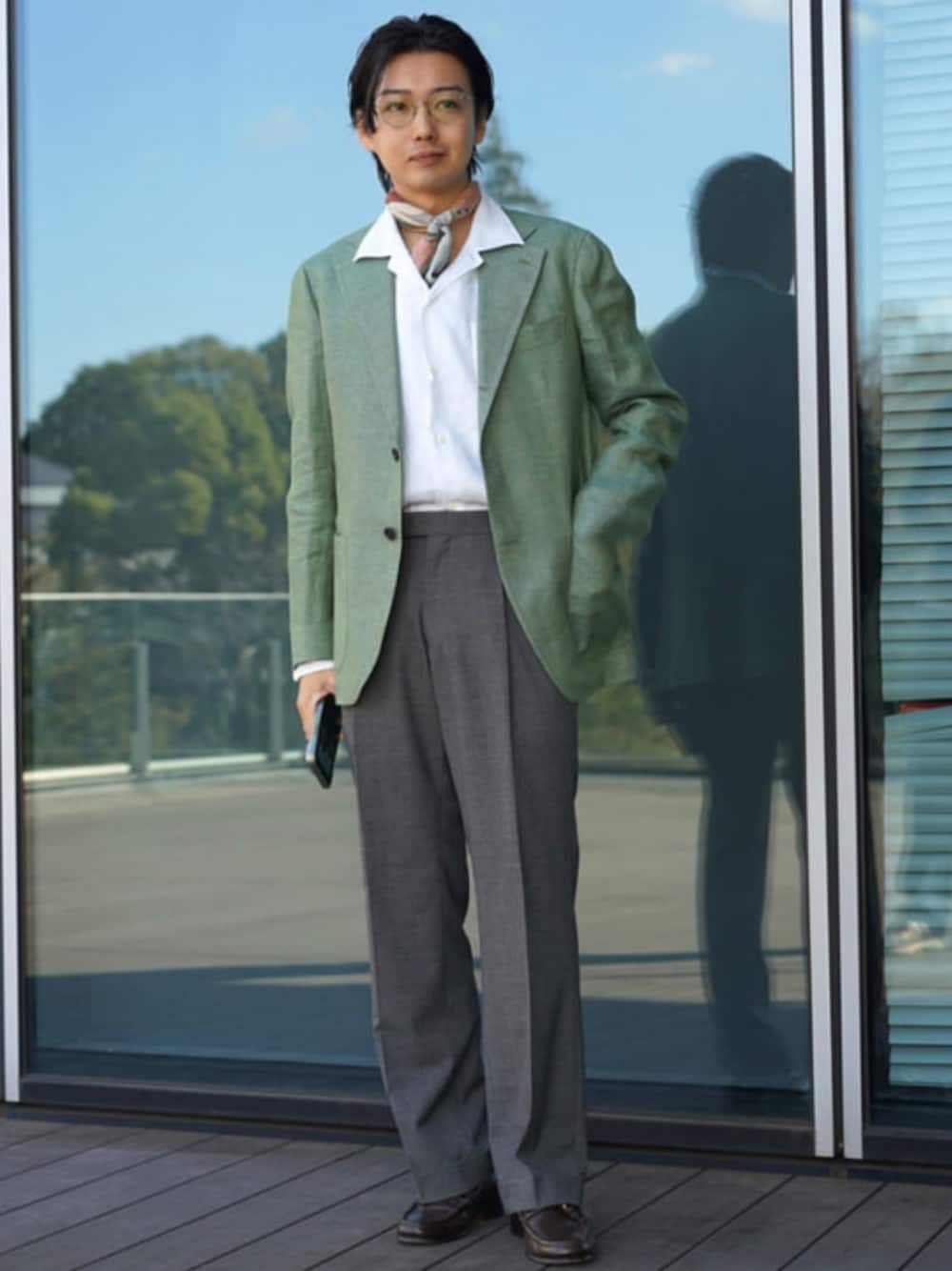 【H.171/ジャケット46/シャツM】 リゾート感のある綺麗な色のリネンジャケットにオープンカラーのリネンシャツを合わせています。ショーツなども相性の良いコーディネートですが、スラックスにビットローファーを合わせてドレスライクに仕上げています。BEAMS F / 小林 俊