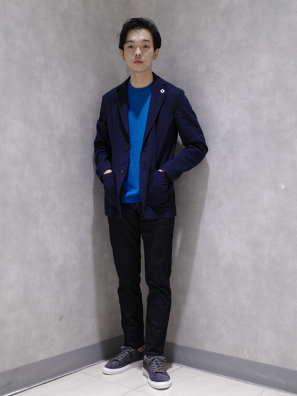 "LARDINI"のシャツジャケットを、ニットにデニム、スニーカーでスポーティに合わせてみました。肌触りの良いニットに、ストレッチの効いたデニムが心地良い組み合わせです。ジャケットはシアサッカー素材なので、これくらい軽快に合わせても良いですね。 ビームス 鹿児島 / 児島 温輝