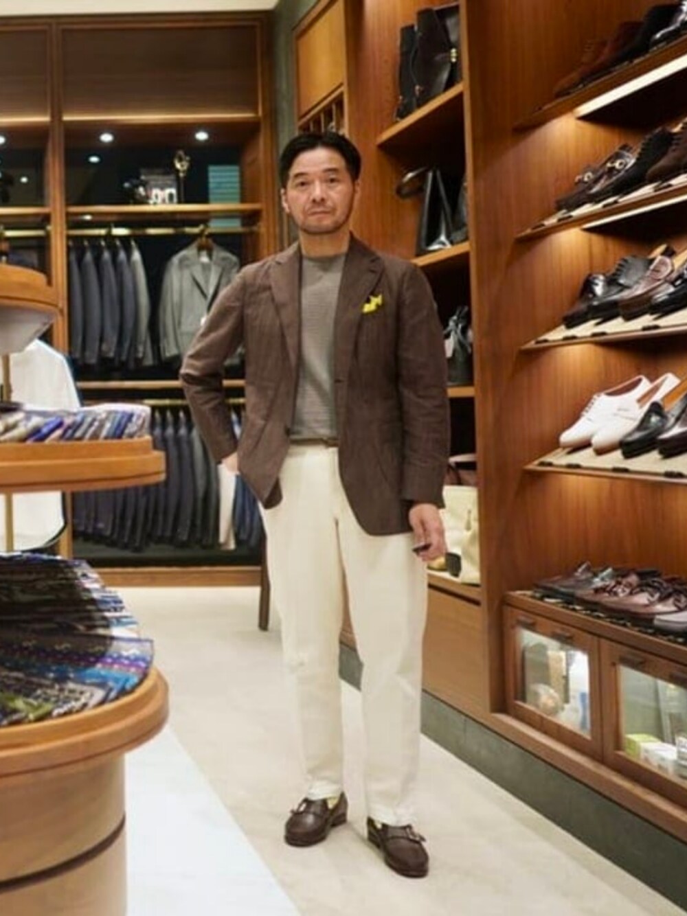 フィンジャックのブラウンジャケットにボーダーTシャツで。イルモカシーノのストラップローファーも履き心地が良く気に入っています。 BEAMS F / 藤本 謹也