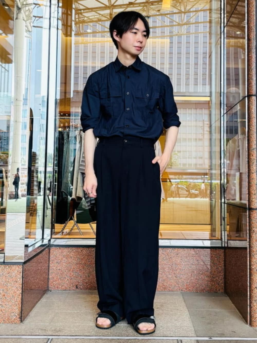 【ネイビーと夏】H.168/シャツS/パンツS/シューズ40/《Brilla per il gusto》軽やかなコットンタイプライター生地のオーバーシャツを夏の着こなしで。ネイビーのワントーン、足元の新鮮な抜け感で仕上げました。 <サイズ感・肌触りなど> シャツは、普段通りサイズSを着用。身幅は、ゆとりがあります。 ビームス 鹿児島 / 王子田 航平