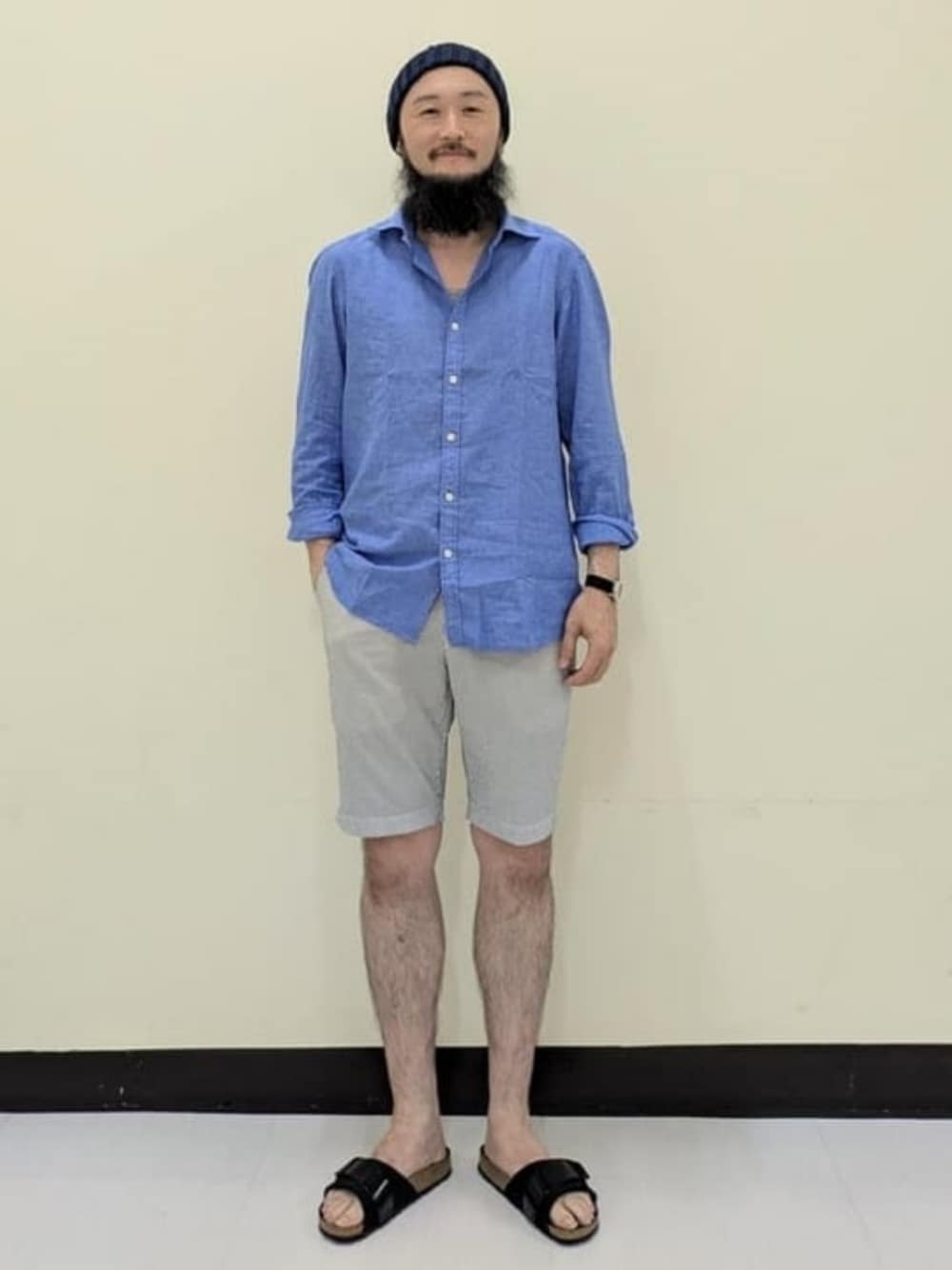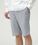〈178cm・66kg〉シアサッカーのショーツに綿麻のシャツを羽織ったリゾートスタイルです。 ビームス 姫路 / 小原 亜樹