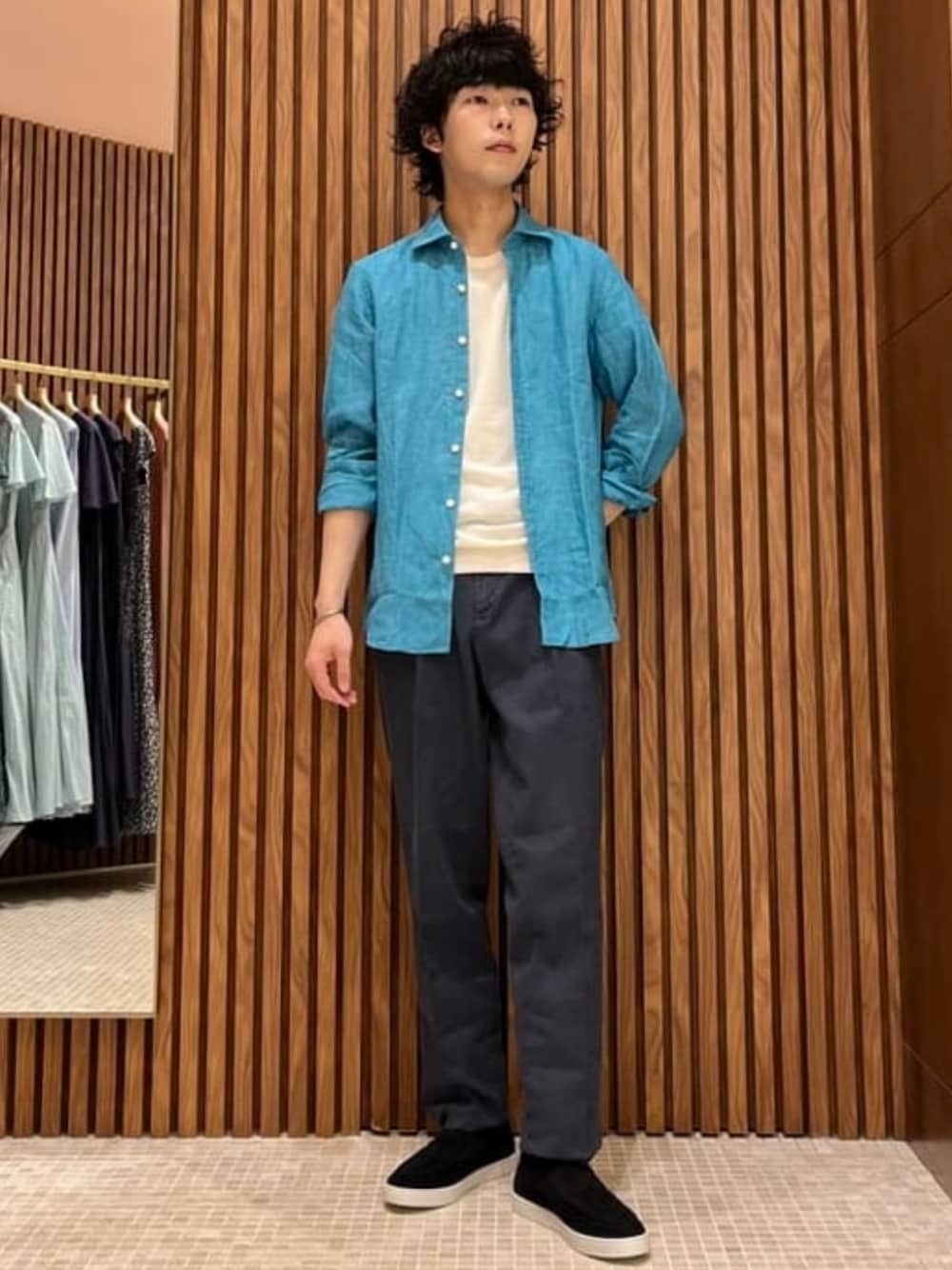 【177cm痩せ型】〈Brilla per il gusto〉の リネン カッタウェイ ワイドカラーシャツ を使用したスタイリング。リネンコットンのスラックスに、スエードのスリッポンスニーカーを合わせて都会的な雰囲気に仕上げてみました。インナーにニットを持ってくることで、シャツのボタンを外してもコーデが成立するようにしています。ビームス ハウス なんば / 末永
