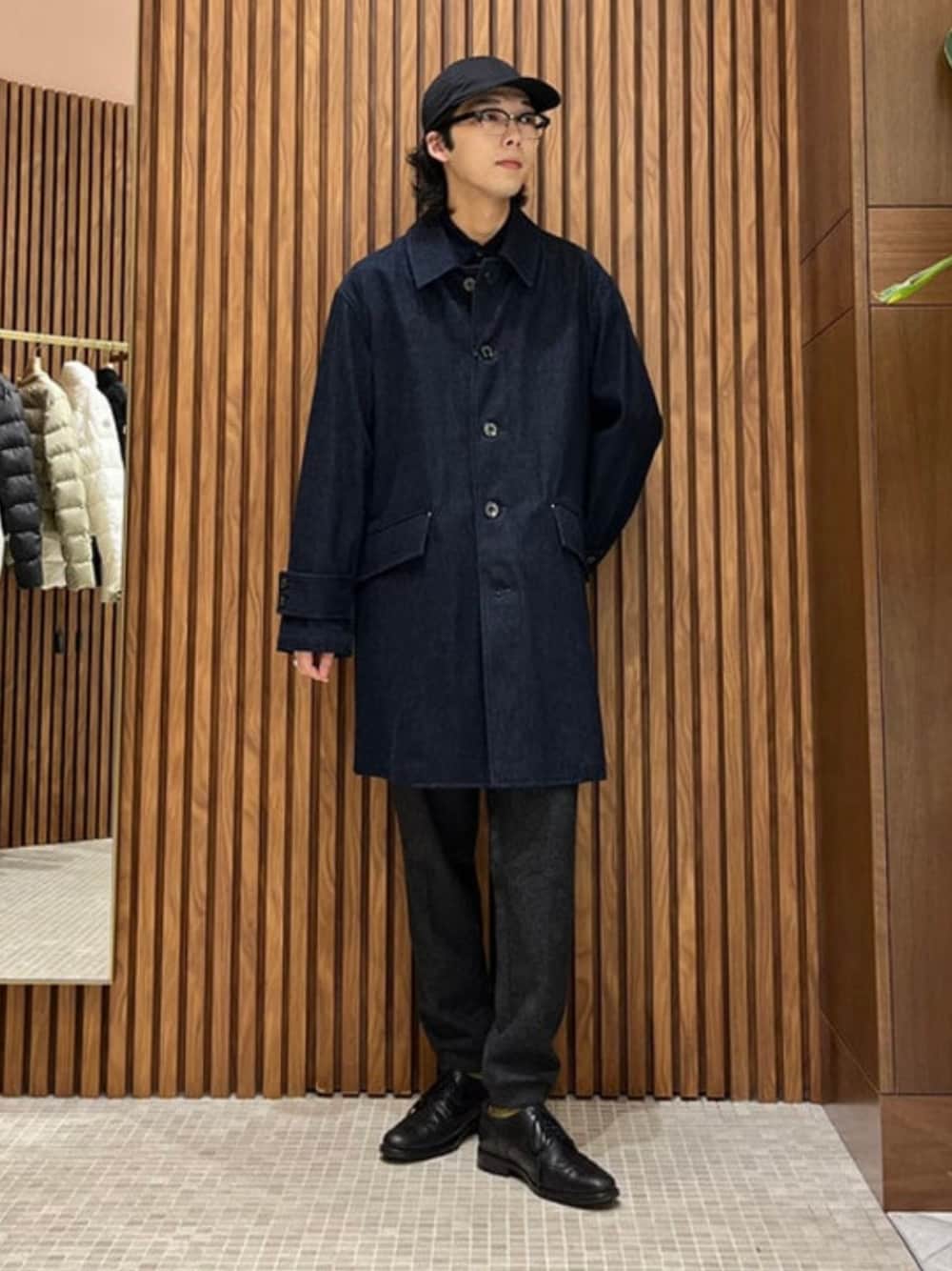 【177cm痩せ型】〈MACKINTOSH〉の 別注 HUMBIE デニム コート を使用したスタイリング。デニムのコートにネイビーカラーのポロシャツを合わせて、グレーのリブパンツを合わせたスポーティーなスタイル。デニムコートに関しては膝上丈なので、クラシックなロング丈のコートが苦手な方にもおすすめできるアイテムとなっております。 ビームス ハウス なんば / 末永
