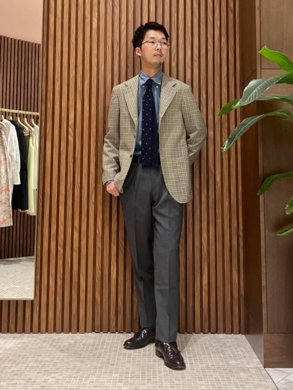 【177cm痩せ型】今回はイエローとグリーンのラインが入ったガンクラブチェックのジャケットを使用したスタイリング。シャンブレーのシャツとニットタイでアメリカンな雰囲気に仕上げてみました。 ビームス ハウス なんば / 末永