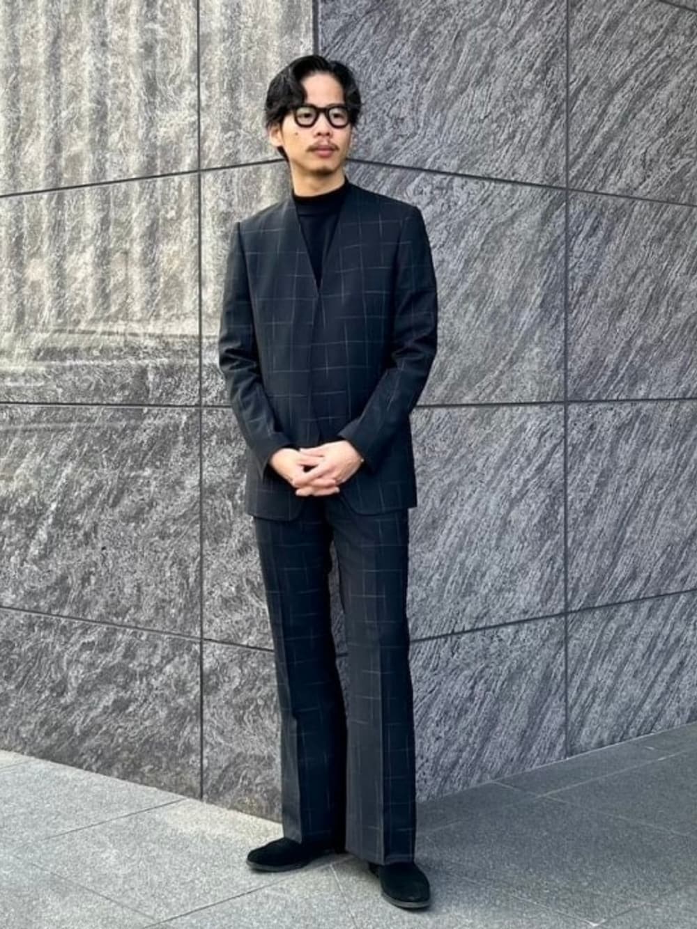 【175cm.60kg】TAILOR GARMENTSでオーダーしたスーツが上がってきました。ボタンレスのノーカラージャケットにフレアスラックスとモードな仕上がり。構築的なシルエット、無機質な面構え、装飾性が全くないデザインが気に入っています。カスリ柄の様な生地に50sの空気感を感じたので、レザーベルトに変えたVENTURAを合わせました。 ビームス ハウス 梅田 / 阿部 宙都