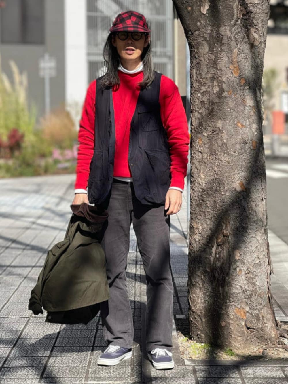 【アラフィフ男のスタイリング】170cm⚫︎今日は、グリーンと赤と紺のコーディネート。ブルゾンの着丈が絶妙にイイ。重ね着するにはイイ着丈。 ビームス 神戸/masuda