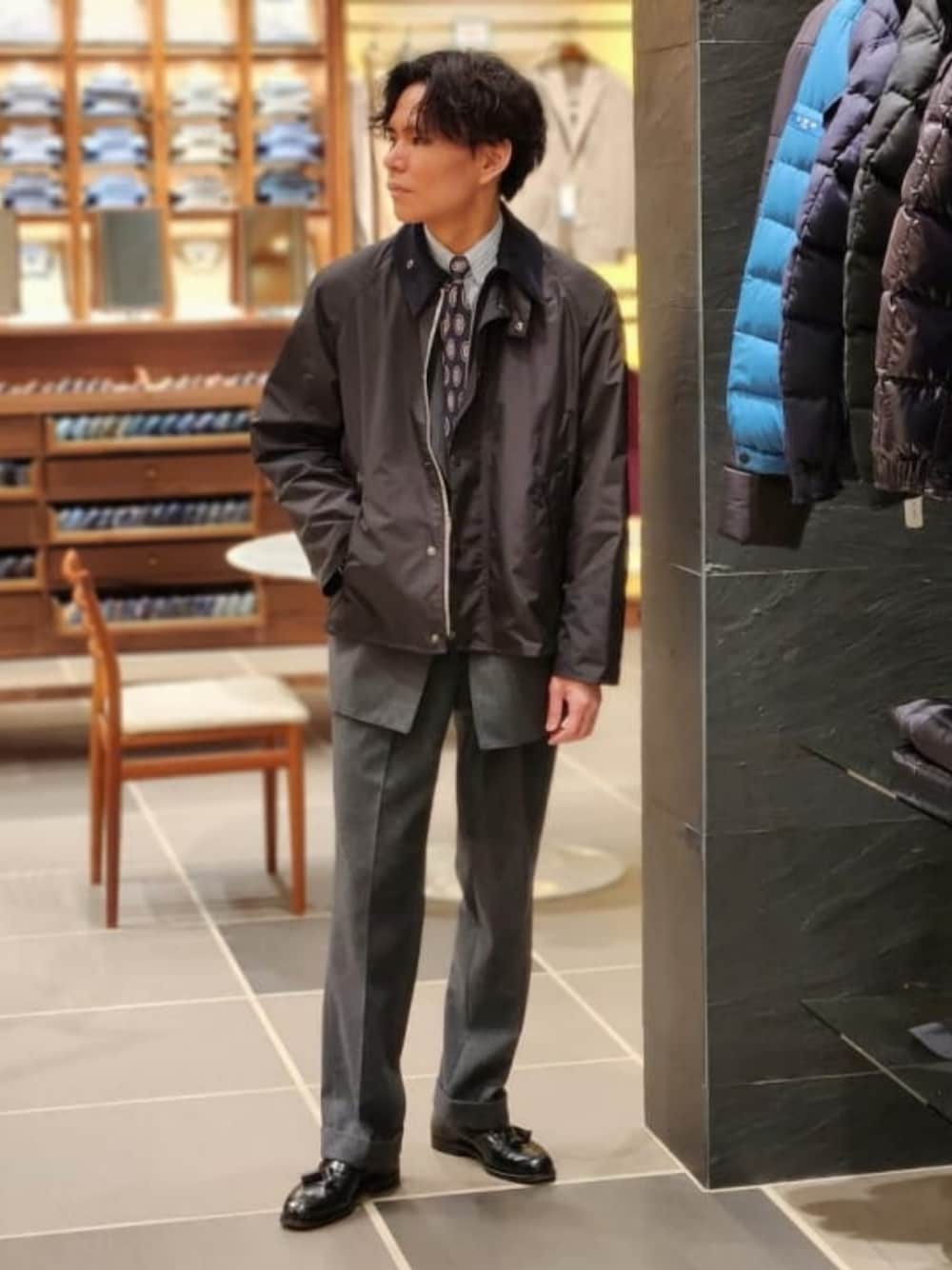 【178㎝/60kg/TRANSPORT40】 グレーのスーツスタイルに"Barbour"の〈TRANSPORT〉メモリーツイルジャケットを羽織ってみました。所謂短丈のこちらのジャケットは何よりもレイヤードが格好良く、とは言え、極端に短すぎないのでスーツやテーラードのジャケットと合わせても違和感なく絶妙なこなれ感を演出します。サイズ感としてはサイズ「40」で袖丈や着丈のバランスもよく、全体的にジャストでした。身幅にはゆとりがあるので、厚みのあるジャケットの上からでもキツさは無かったです。 ビームス 鹿児島 / 小園 正吾