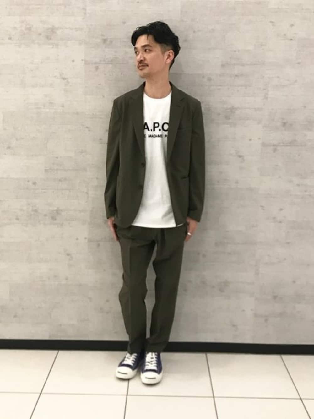 機能素材AVANTを使用したセットアップをメインに。Tシャツと合わせカジュアルコーディネートに仕上げました。ジャケット、パンツ共に機能性が優れている点がお勧めです。