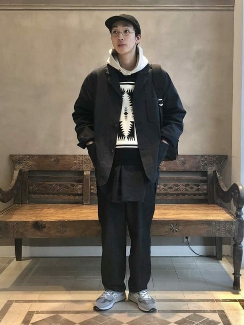 ネイティブな柄が目を引くPENDLETONのニットベストは、パーカーの上からでも着れるゆったりとしたサイズ感。 ネイビートーンのコーディネートの中で静かに主張させました。