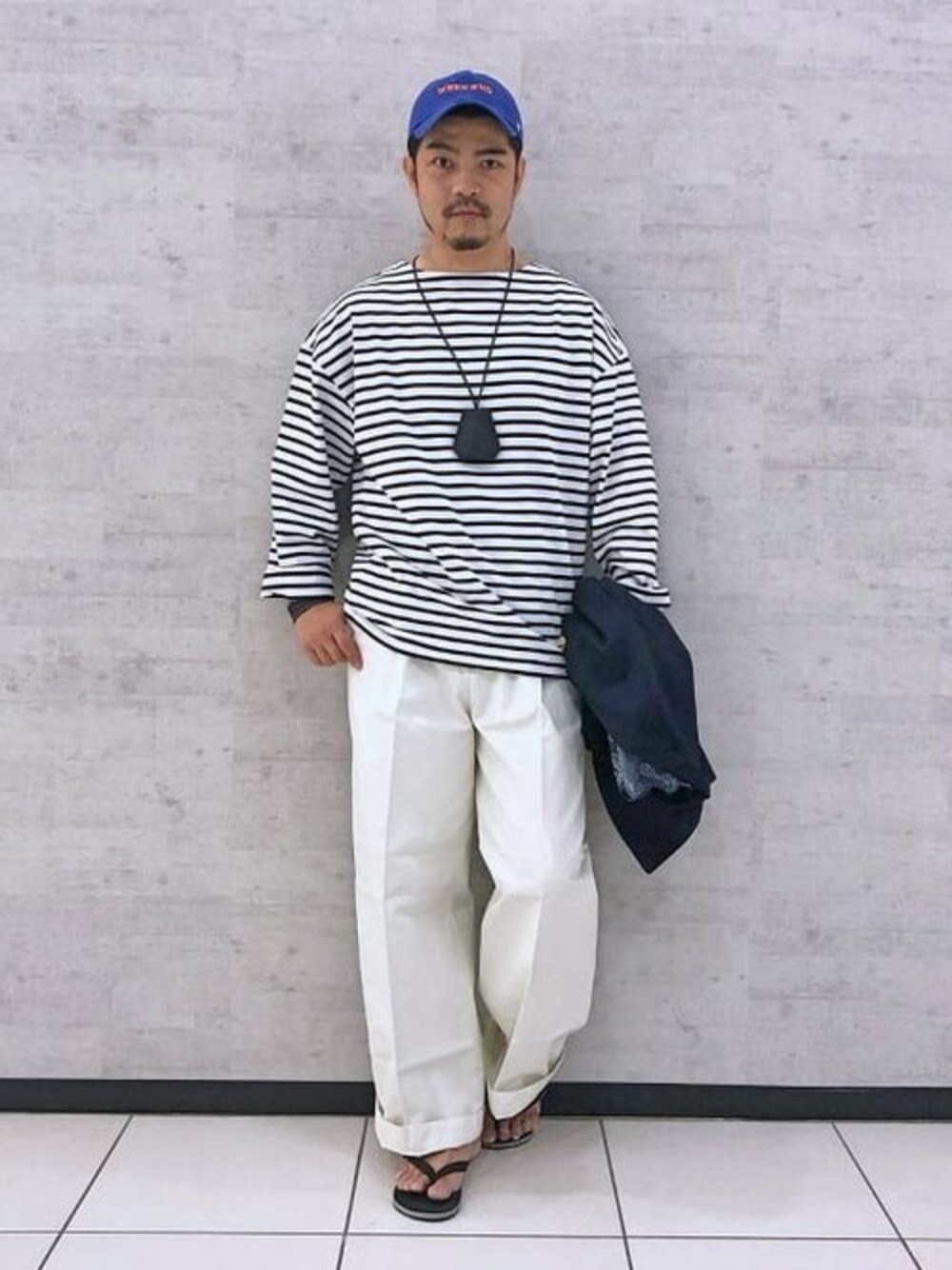 【オールホワイトのマリンスタイル】 トップス・ボトムスともにホワイトでコーディネート。全体のシルエットはルーズにし、CAP以外の小物やシューズは黒でスッキリ見せました。