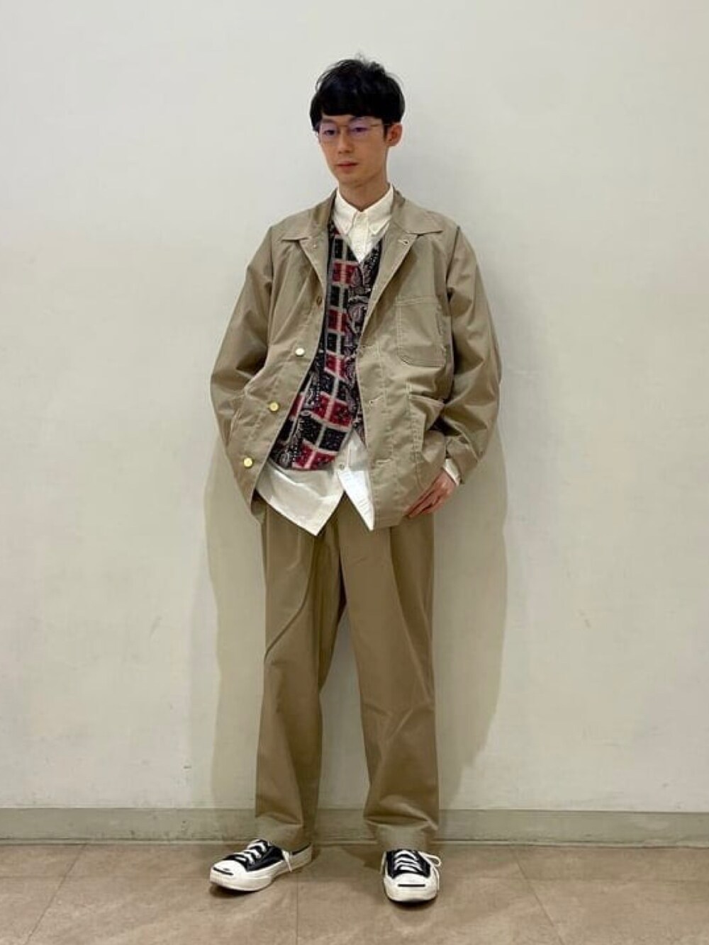 【春のベージュコーデ】ベージュのカバーオールとパンツで軽やかにしました!カバーオールは程よいゆとりでゆったり着ていただけます!パンツはバックにジップが付いており、シルエットを変えることが可能!汎用性高しです! ビームス 新宿 / うえきんぐ