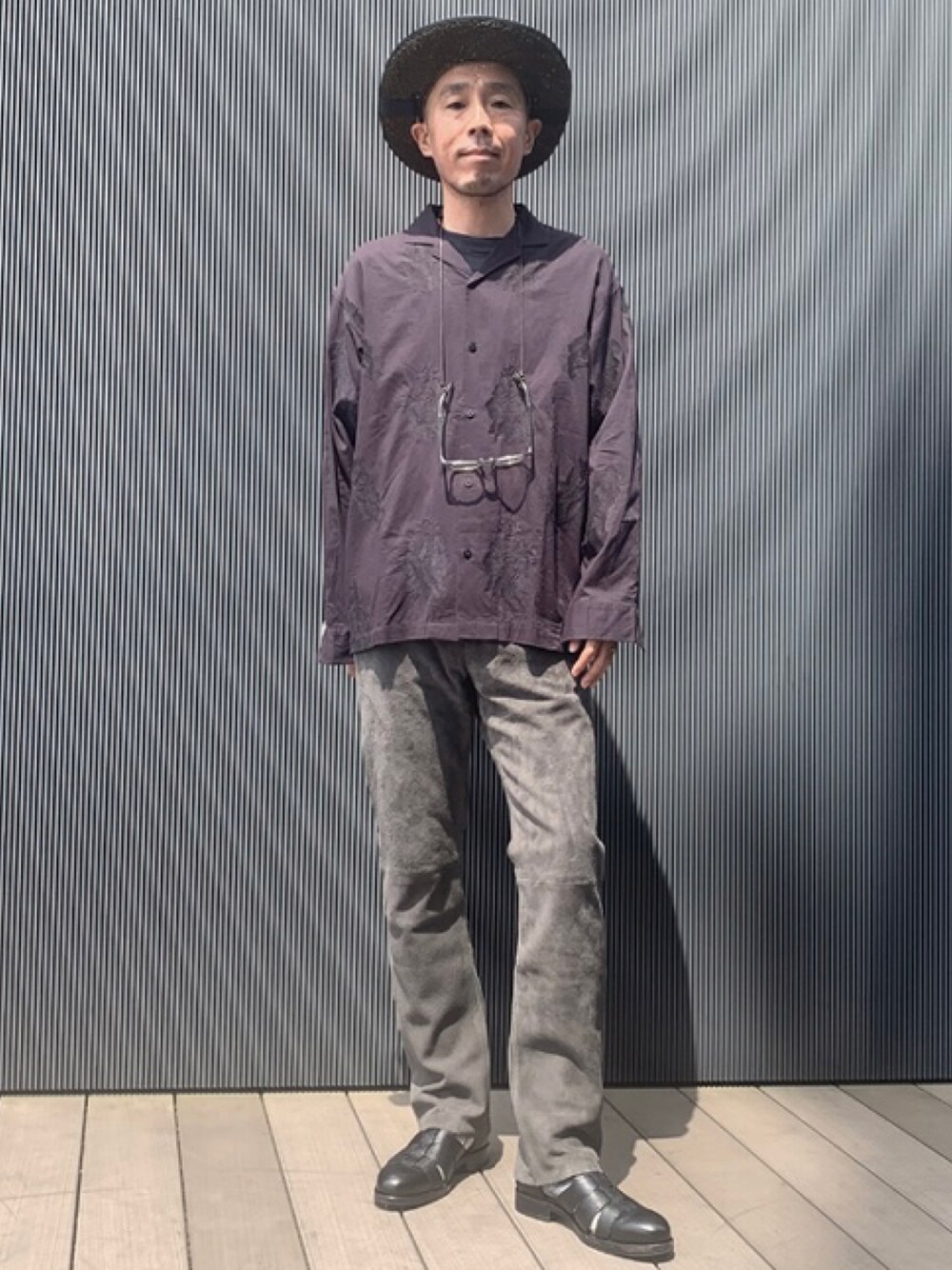 久々にレザーパンツの気分到来。ニュアンスカラーでハード過ぎない仕上がりでコーディネートの自由度が高い山羊革スエードです。シャツは薄手のボイル素材にオリジナルの柄を刺繍で表現したクラフト感がポイント。 BEAMS LIGHTS / 伊藤 雅人