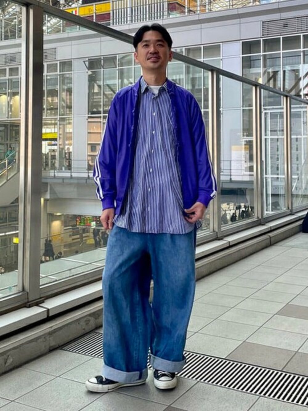パープルのトラックジャケットをメインに!! 冷込み日などはインナーにもオススメです。 また、チャイナボタンを是非アクセントにして頂ければと思います。 清水 敬祐
