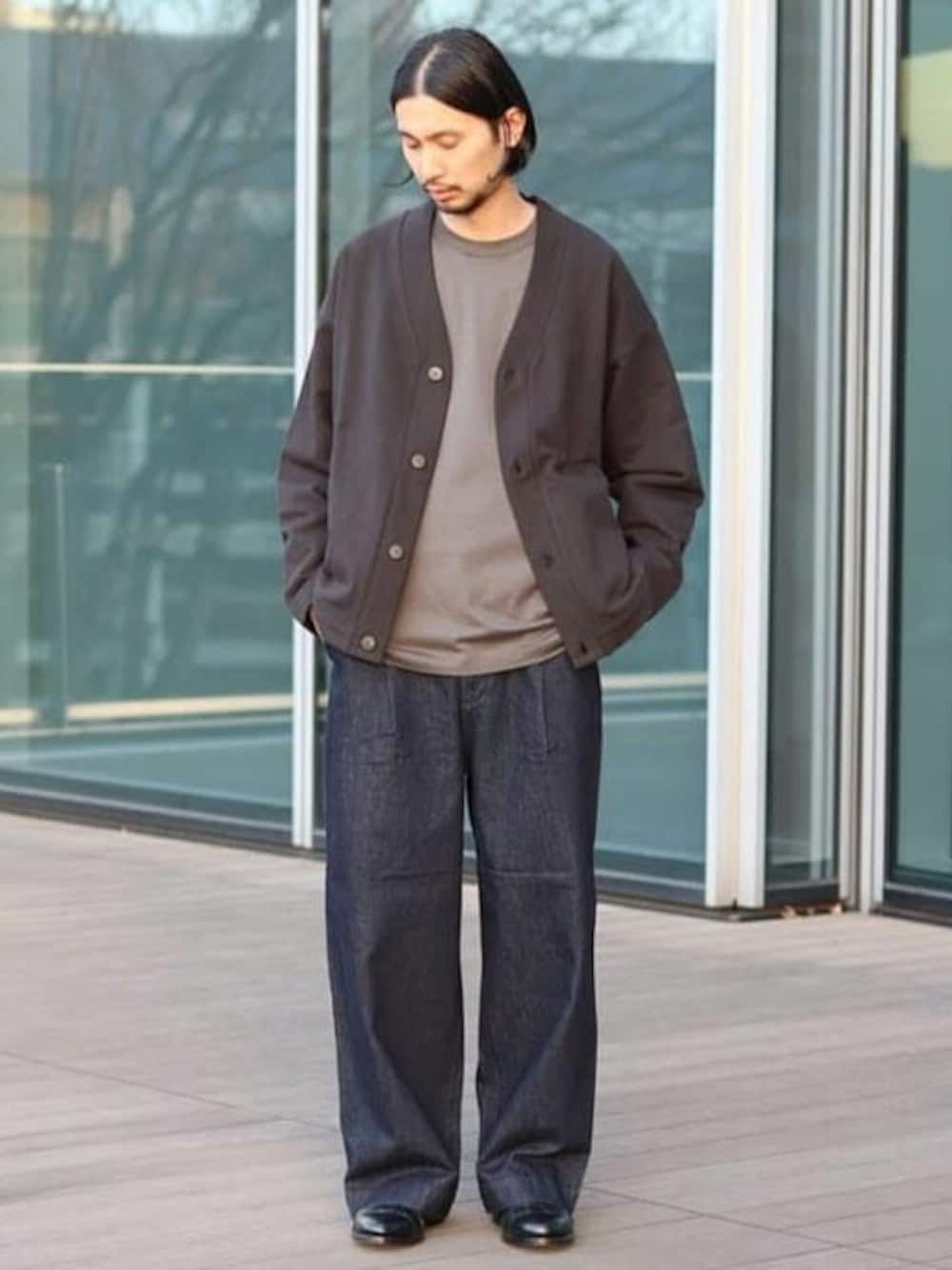 ありそうで意外と少ないスウェットカーディガン。これからの時期かなり重宝しそうですね。定番のワイドパンツに合わせて、シンプルなバランスで。