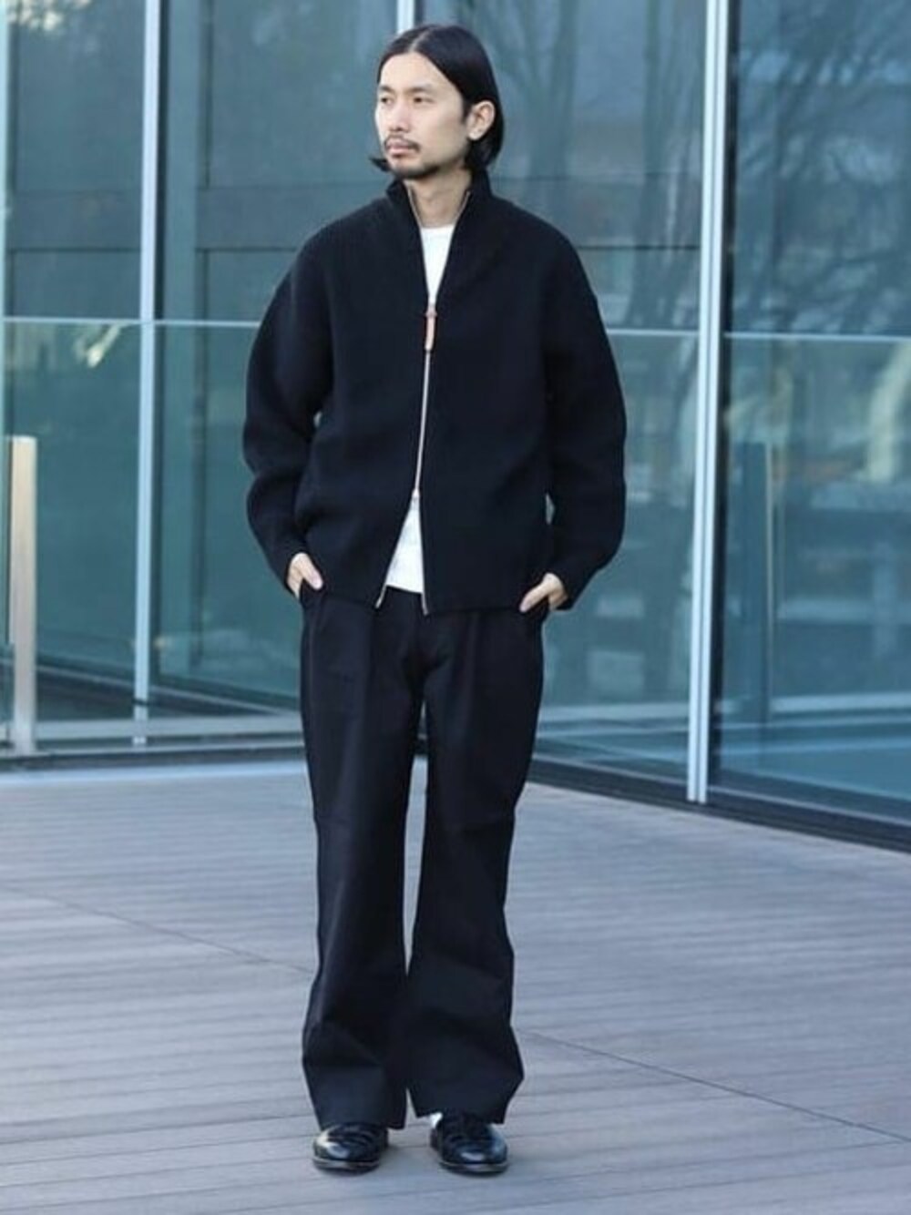 今シーズンアップデートしたドライバーズニット。シルエットや素材、引手のレザーなどさらに上品なアイテムに。パンツはULTERIORに別注をしたスビンコットンのパンツ。間違いない逸品です。