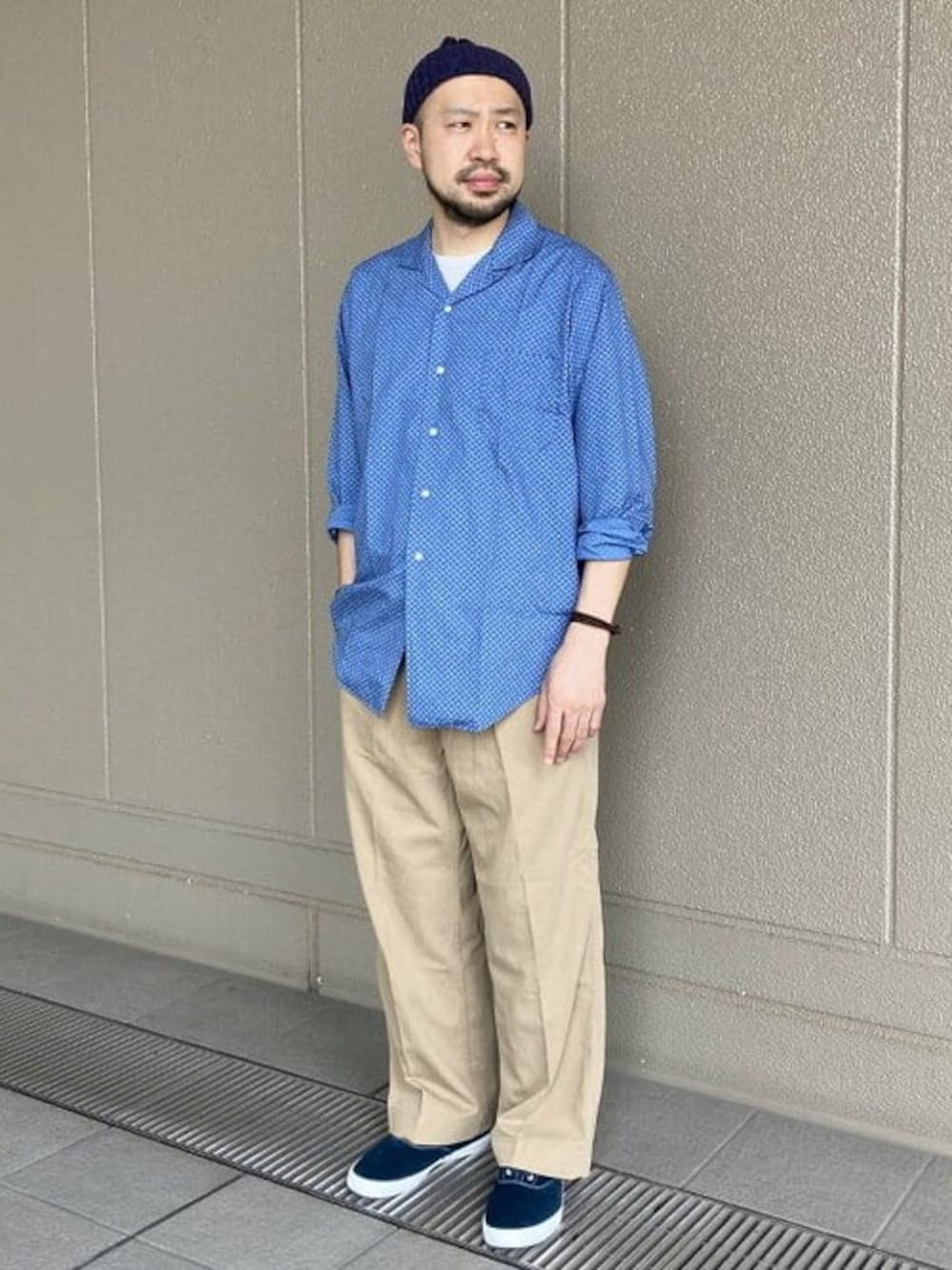 鮮やかなサックスブルーのオープンカラーシャツは、ゆったりとしたシルエットの為バランスを考え太めのチノパンを合わせました。 enjoy styling !