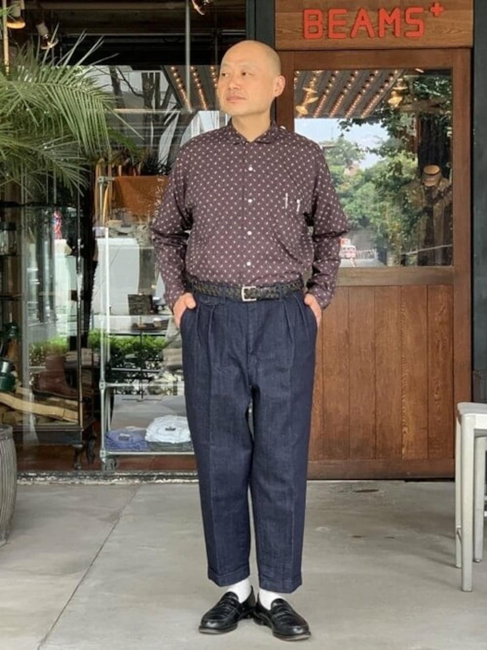 総柄プリントシャツのスタイリングです。地がネイビー系なので、パンツは濃色インディゴの物をチョイスしてトーンを揃えました。総柄物はトーンが近い同士で揃えると着こなし易いと思います。