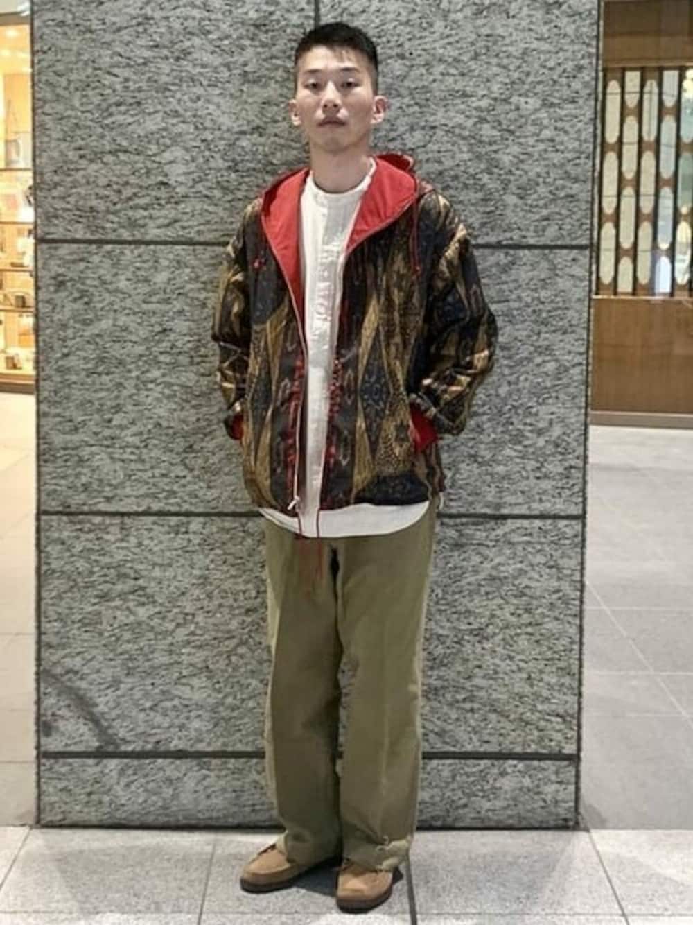リバーシブルのフードブルゾンをメインにスタイリング。バンドカラーシャツにミリタリートラウザーとアウトドアらしいコーディネートを表現。色も淡いベージュ系で纏めることで、ブルゾンのバティック柄を引き立たせています。