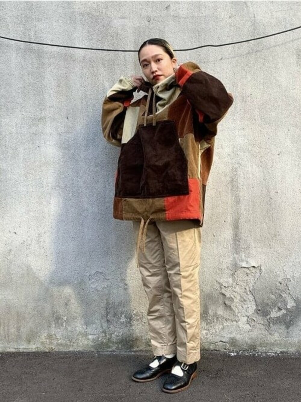 女性にも嬉しいカラーリングのアノラック。緩めなサイズ感のトップスに対しボトムスはすっきりとした形の1プリーツチノをチョイス。女性らしさを忘れないシルエットに。
