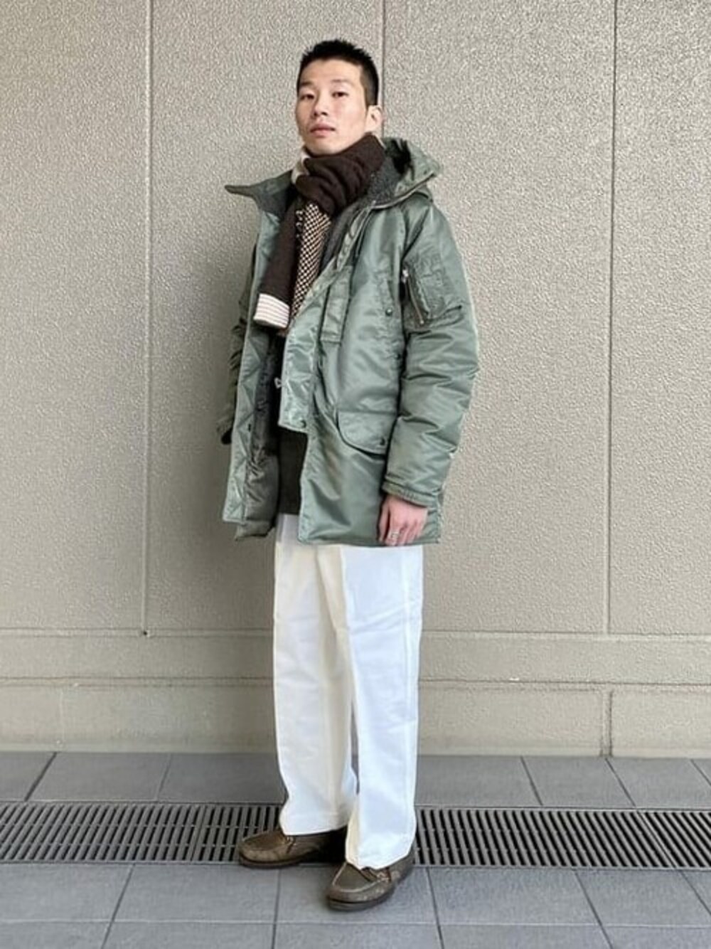 着用しているN-3Bダウンは、保温性が高いのは勿論のこと、見た目の重厚感とは裏腹に軽さも兼ね備えたアウターです。ミリタリートラウザーで合わせたミリタリールックですが、ホワイトをチョイスする事でクリーンな印象に仕上げております。