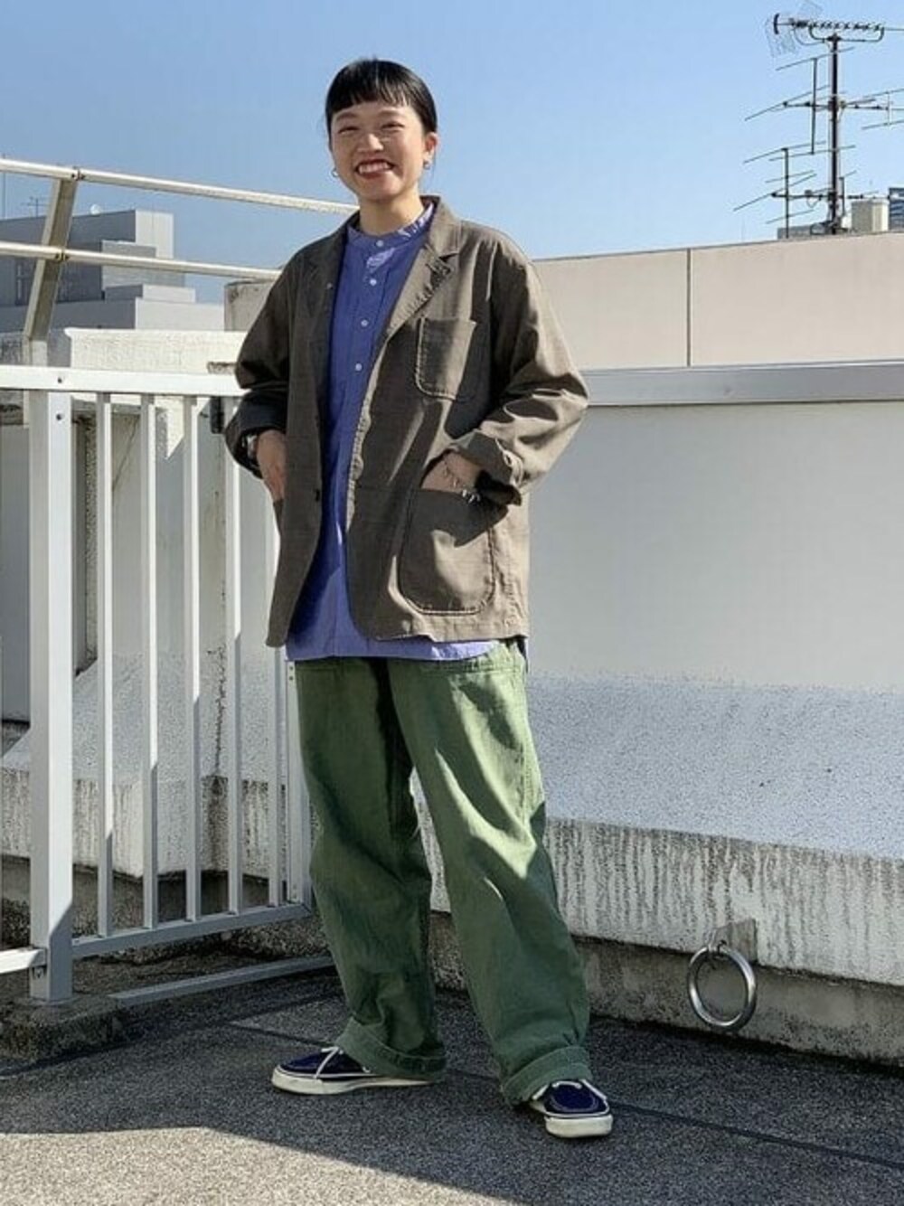 お気に入りのジャケットのインナーに、ゆるくバンドカラーのシャツを。〈BEAMS PLUS〉のジャケットとパンツはどちらもくすんだ色味で合わせ、シャツと〈converse〉のヒールスターはネイビーでカラーマッチングを意識しました。