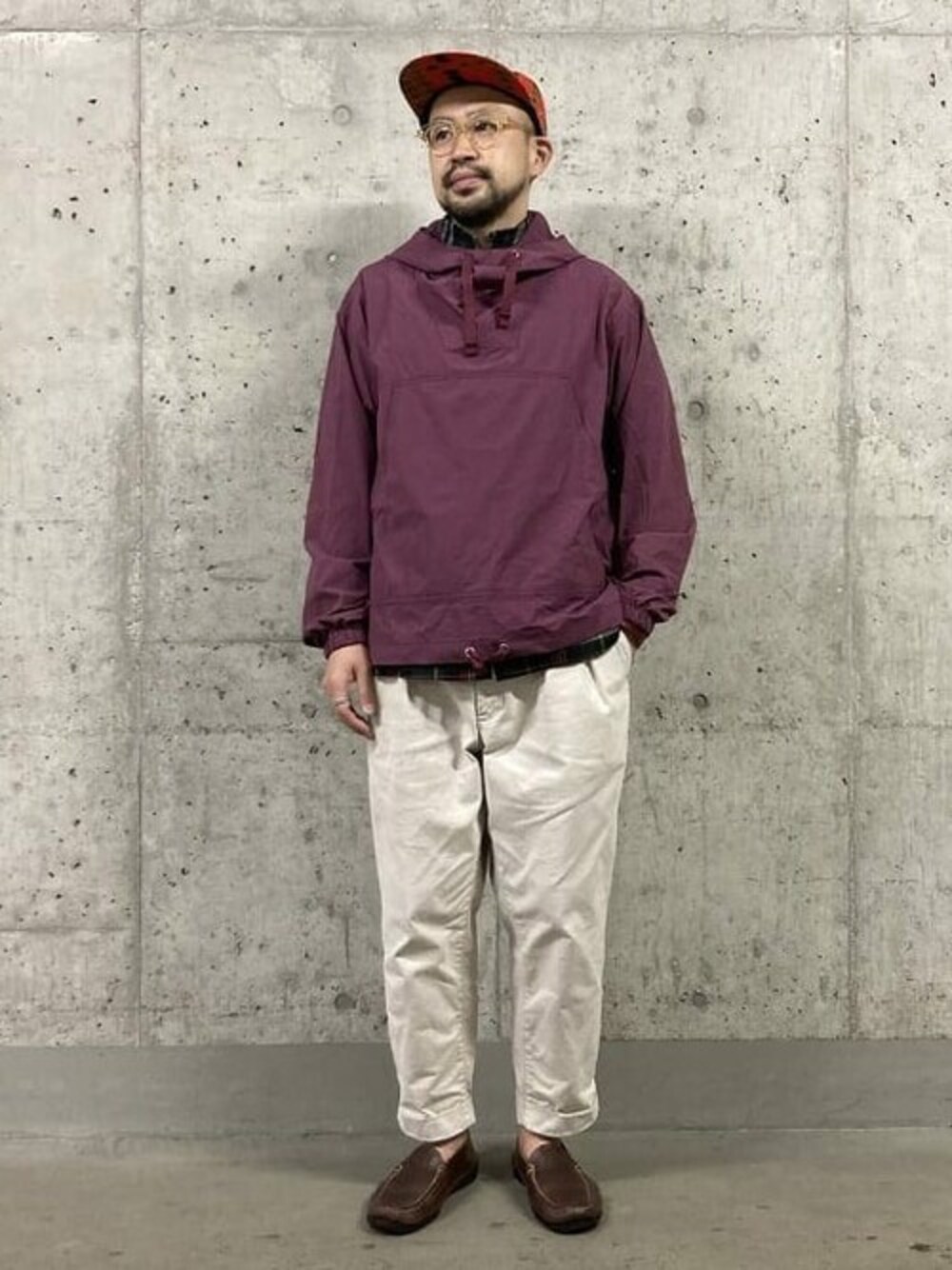 アウトドアな雰囲気漂うシンプルなコーディネートですが、インナーに挟んだチェックシャツの柄から覗くレッド、フィッシングキャップのカラーもレッドにしミルスモックのバーガンディに合わせていきました。 enjoy styling !