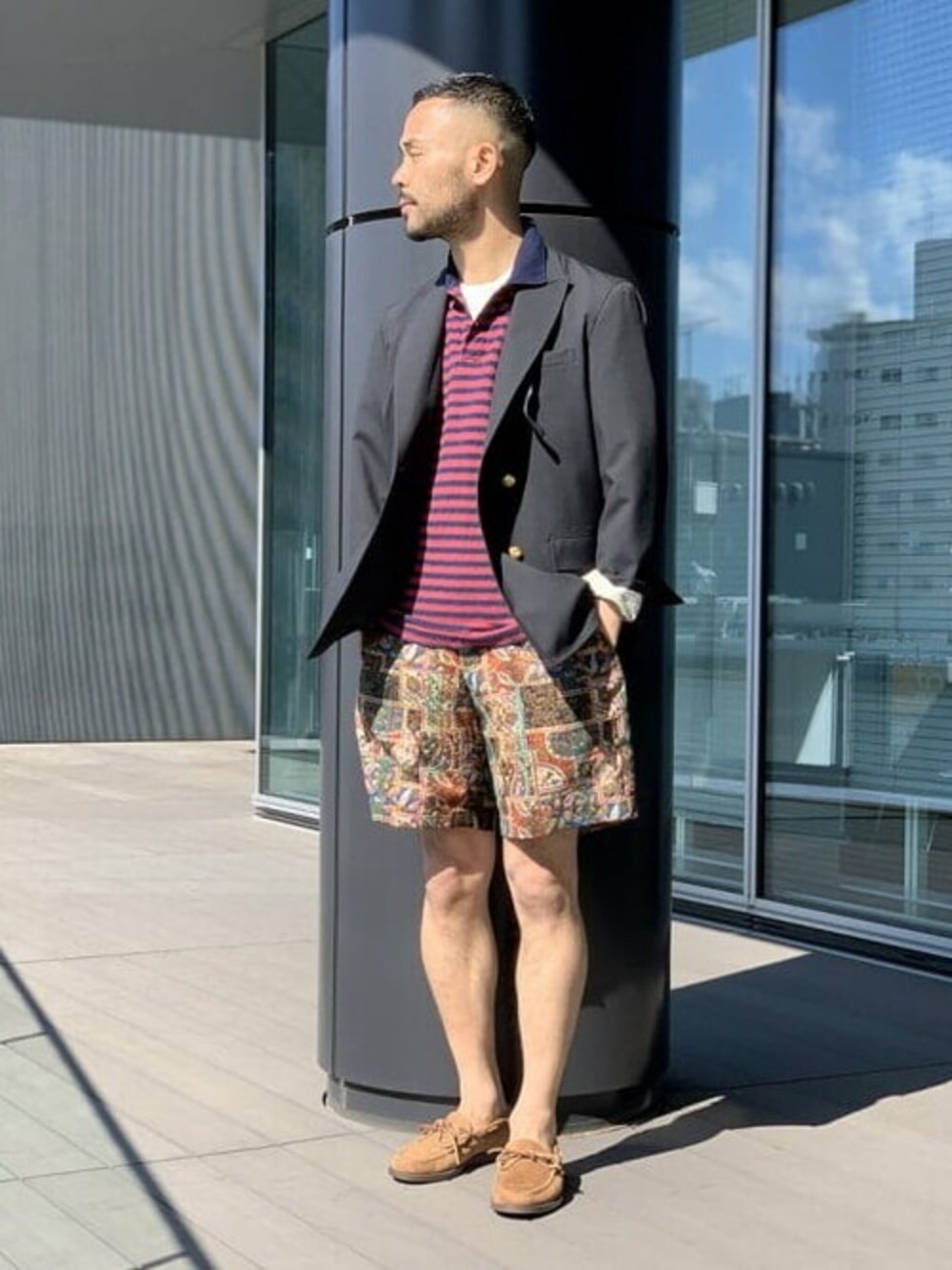 〈BEAMS PLUS 2021Spring&Summer Vol.7〉 BEAMS PLUSと言えば、やはりネイビーブレザー。多くの方にご好評頂き、ありがたくも毎シーズン完売必至です。シングルをお持ちの方、是非ダブルブレステッドにもマストです。ボックスシルエット、ショート丈のニューポート型。クラシックな面構えながら、カジュアルにもこなせるのがBEAMS PLUS流のスポーツコートです。レジメンタルストライプを思わせるインディゴポロシャツ、バティック柄をプリントしたサマーウールのワイドショーツ。カジュアルごなしでスタイリングしました。