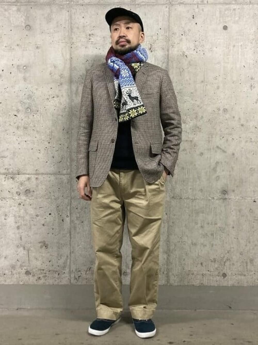 クラシカルなハウンドトゥースのスポーツコートに、 ポップな配色のノルディックがらのマフラーを。 少し落ち着いたトーンのブルー×グリーンは、 アダルトなコーディネートにも 取り入れていただけるオススメのマフラーですよ。 enjoy styling !