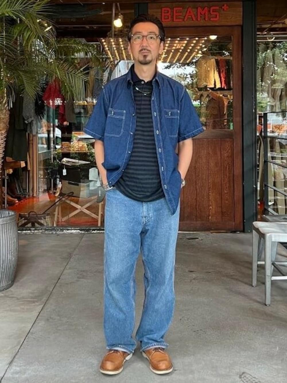 今期製作した、経緯インディゴ糸の濃淡で表現したBEAMS PLUS シャンブレーは、半袖バージョンも取り扱いがございます。 半袖は、軽快に羽織りたく、Mサイズでゆったりと。インナーはインディゴのボーダーポロ。何の気無しのレイヤースタイルで、ワーク感と日常着のムードを。 BEAMS PLUS / 山田 広志(兄)