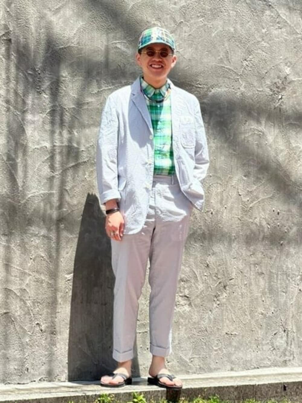 BEAMS PLUS夏の定番。シアサッカーのセットアップを着用。簡素な作りのシャツジャケット型なので丸洗いが可能かつ速乾素材。さらにはストレッチ仕様で着心地も快適です。蒸し暑い東京の夏にも対応できるアップデートされたシアサッカースーツ。オススメです。 BEAMS MEN渋谷 / すずき しゅうじ