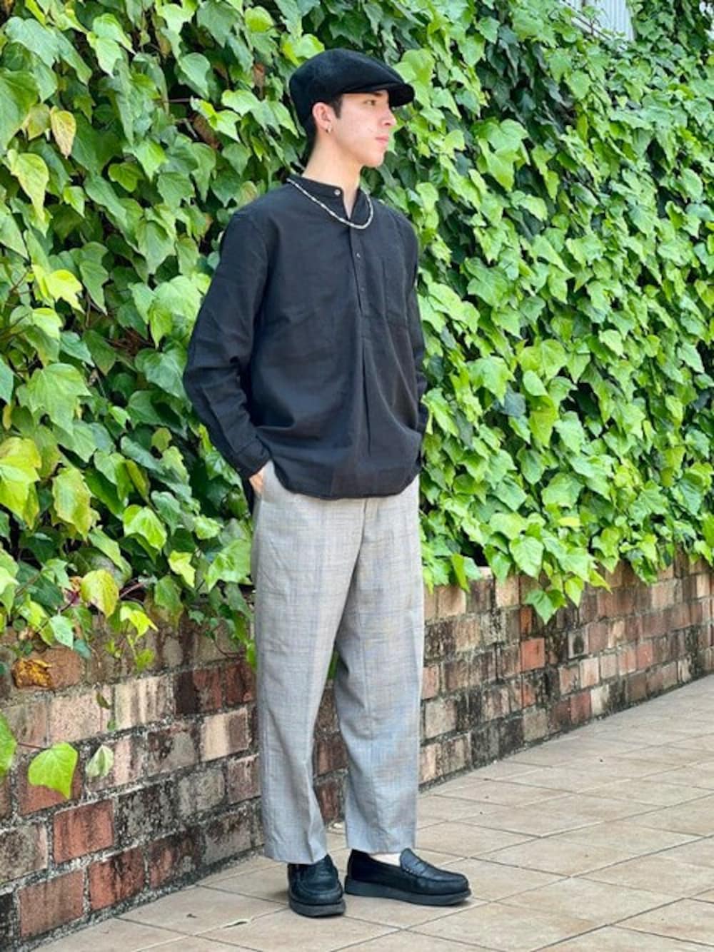 モノトーンのコーディネートですが、素材は軽やかに涼しく。グレンチェック柄のドローストリングトラウザーは、トロピカルウールを使用したサラッと軽やかで夏に向けてオススメのトラウザー。半袖のニットポロなんかで合わせても良いかなと。ビジネスカジュアルにもオススメです。そしてコットンリネンのバンドカラーシャツは毎年オススメ。ブラックにインディアンジュエリーのナバホ族のビーズネックレスが映えます。 BEAMS 辻堂 / ニース