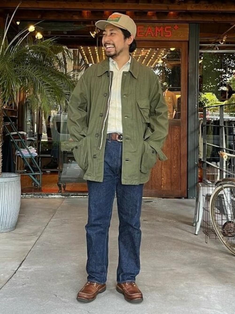 BEAMSでは本日から秋冬の洋服へ移行する期間に突入。ただ、外はまだまだ暑いということで程良く、見た目からの軽快さという所もキャップのロゴや、インナーのシャツで抑えつつ。オリーブカラーのミリタリージャケットをベースにいなたいコーディネート。男らしい武骨なイメージで。 BEAMS PLUS 原宿 / 佐藤 亮介