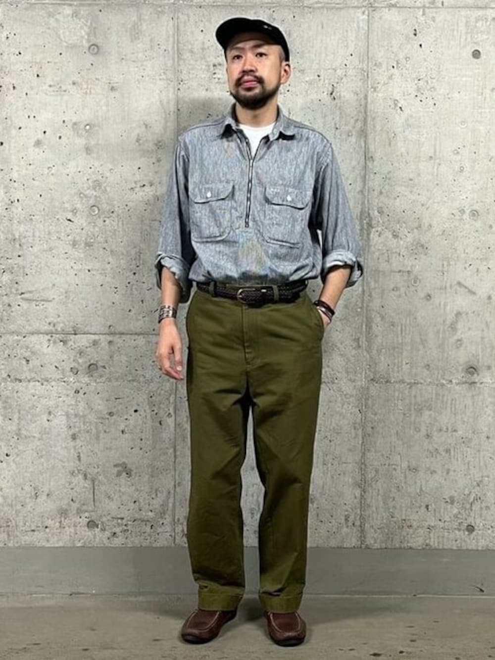 ハーフジップのワークシャツとトラウザースとの組み合わせの時は、シャツの裾はタックインがオススメです。 パンツのシルエットが綺麗に出ますし、少したゆんだシャツの膨らみも雰囲気良し。 BEAMS 神戸 / みたに いくお