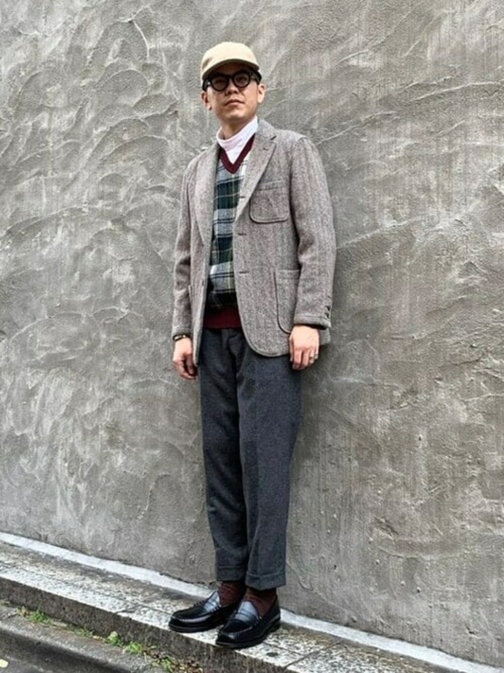 ウールニットベストにツイードジャケット。インナーはTシャツくらいがちょうどいい気温ですね。秋冬らしい素材感のアイテムで、秋冬らしい渋めなカラーリングでまとめました。 BEAMS MEN 渋谷 / すずきしゅうじ