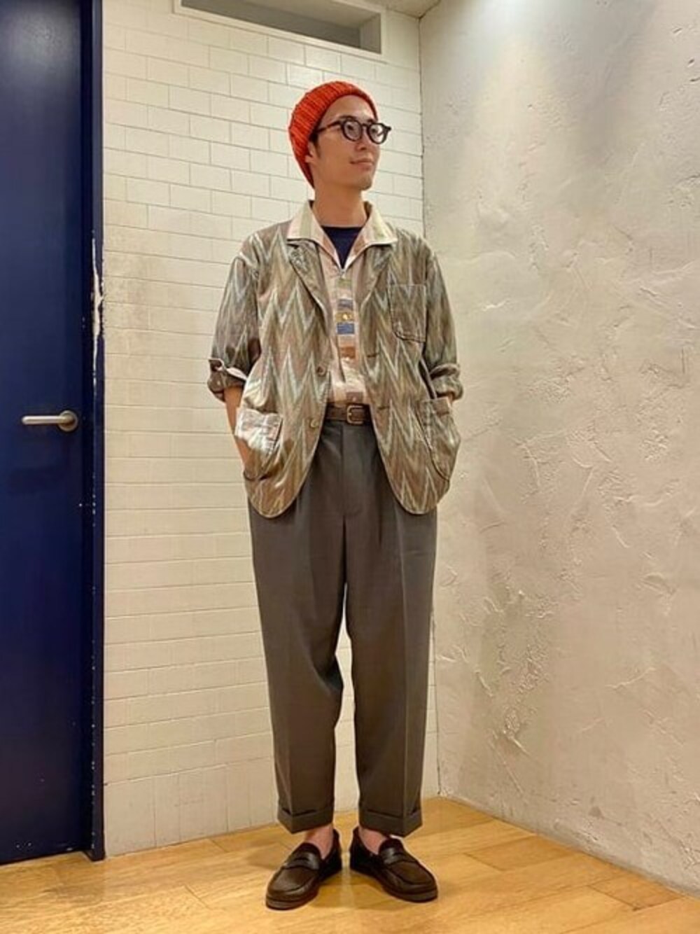 イカット柄のシャツジャケットを捲り上げたリゾートテイストな着こなし。中にはイタリアンカラーシャツで洒落っ気の強い合わせです。ワッチキャップのカラーやローファーの素材感の違いもアクセントになります◎ BEAMS 新宿 / きむらゆうた