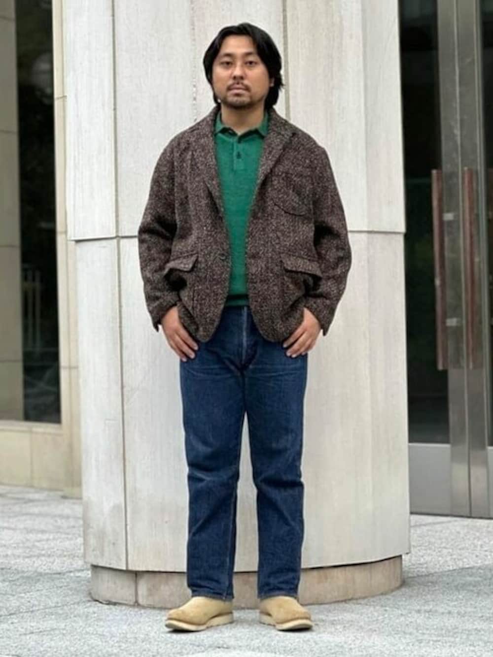 ツイードのジャケットに、デニムパンツ、ワークシューズと武骨でクラシックな香りのコーディネート。ですが、ビームス プラスのニットポロシャツのカラーリングが野暮ったい雰囲気を華やかにしてくれます。程良いウエイト感なのに、ウーリーな表情は必見です。 BEAMS PLUS / 佐藤亮介