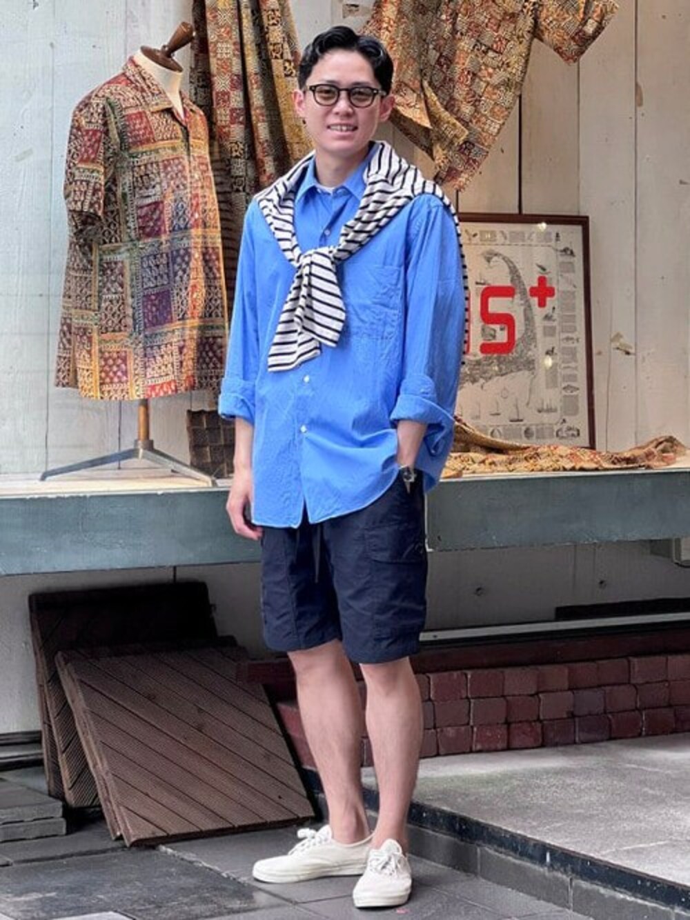 <sage de cret>別注の"2way Canadian Army Cargo Shorts"をマリンスタイルに。 艶感のある生地、リラックスしたフィッティングの<KAPTAIN SUNSHINE>のレギュラーカラーシャツは深いブルーが品良く見えるお気に入り、バスクシャツを肩掛けしムードを高めました。 足元にはキャンバスシューズを合わせ軽やかにまとめました。 BEAMS PLUS / 坂本翔一
