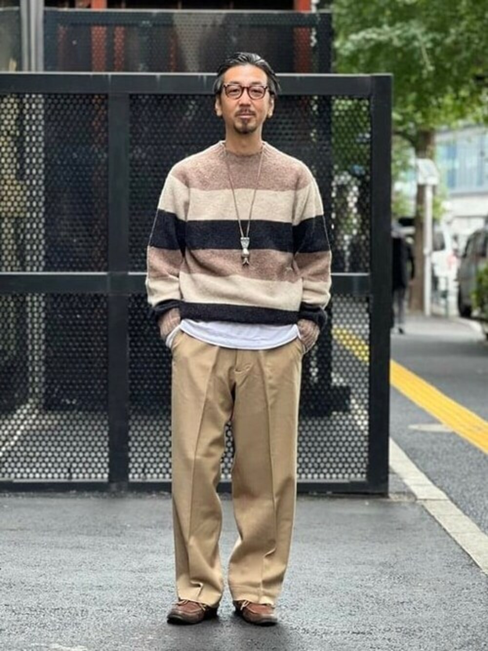 ストライプの配色を図らずとも意識してしまったコーディネート。若々しい印象のあるストライプもニットとくれば話は違ってくる。柔らかい表情のあるウールのニットは、編み立てまでスコットランドで作成された逸品。合わせたパンツは、チノトラウザーズと思わせぶりな、ウールのトラウザーズをラフに。ベースはいつものミリタリースタイルも、脇割り仕様ですっきりとキレイめな仕立てがお気に入り。いつもの普段着も品良くコーディネート。 BEAMS PLUS / 山田 広志(兄)