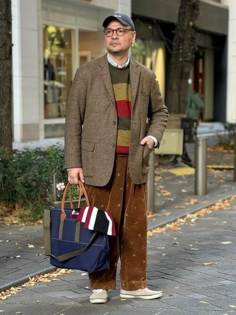 冬空の下、BEAMS PLUS TAILOR LINEのスポーツコートをメインに、いつものトラッド風味でカジュアルスタイリング。好みでもある暖色系アイテムで、季節感を意識しています。先日発売となった「L.L.Bean × BEAMS PLUS」のBoat&ToteはLサイズを合わせています。レザーハンドルでシックな配色は、冬のスタイリングとも良く馴染みます。