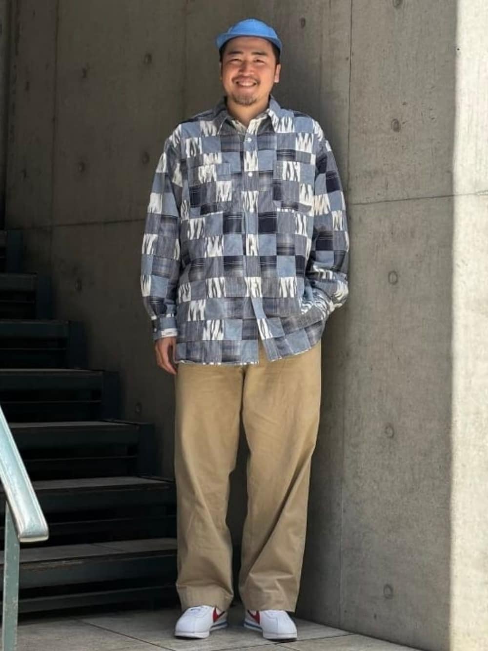 多様な柄がパッチワークとして施されているワークシャツは、シャツ一枚のシンプルなスタイリングでもアクセントとなってくれます。色使いに意識しながらナイロン素材のキャップと、ナイキのスニーカーで合わせスポーティな印象にしました。ビームス 二子玉川 / 尾島 凌太