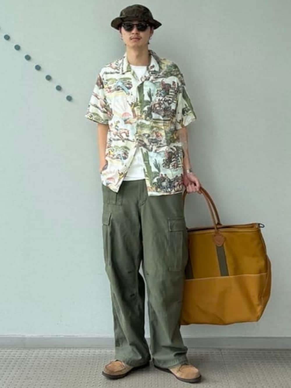 本日は、【別注】REMI RELIEFのレーヨンプリントシャツを着用しました。オリーブのパンツとの相性がめちゃくちゃ良かったので良かったら参考にしてください。ビームス 名古屋 / 文太