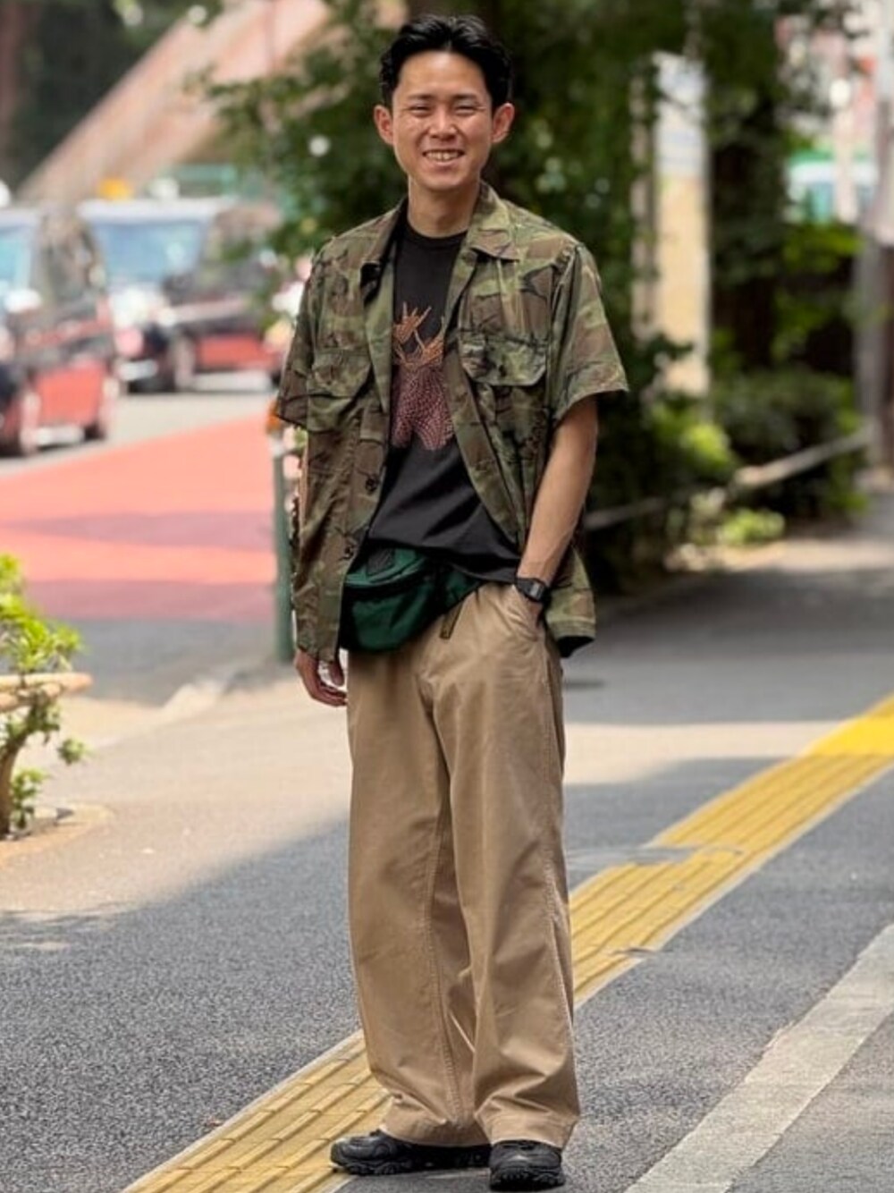 ミリタリーとアウトドアのミックススタイルです。 "BEAMS PLUS"のミリタリーシャツはメッシュになっており通気性が良く、夏のコーディネートにピッタリ。 ブラックのカットソーをレイヤードして手堅いカラーリングに纏めました。 華やかさと機能性をプラスする為、ウエストバッグをはじめて取り入れてみました。 実際の使用感も良いですし、シンプルなコーディネートのアクセントにちょうど良いのでオススメです。 ミリタリーチノは腰履きし、Aラインのシルエットに纏め全体のシルエットを整えました。ビームス プラス 原宿 / 坂本 翔一