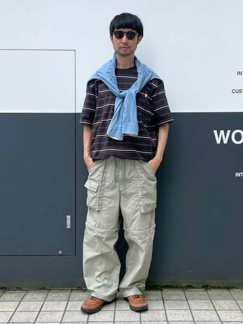 【ジメジメ】で暑い梅雨シーズンはコンバーチブルのパンツが重宝します。ジップを半分開けると風通しが良く◎ トップスは今季お気に入りのジャガードボーダーTを着用。色使いが◎ シンプルなスタイルでしたのでシャツを肩掛けしました。