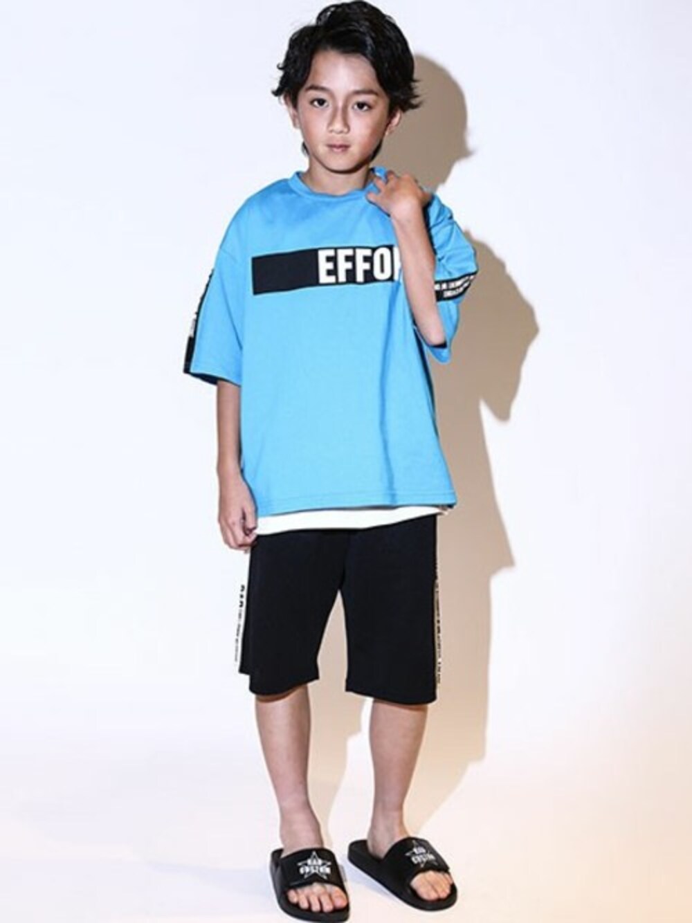 【RAD CUSTOM (ラッドカスタム)】 スポーツテイストのビッグTシャツが目を引くコーディネート。 バックや肩部分のロゴテープ使いがCOOL★ 同じロゴラインの入ったボトムスを合わせてスタイリッシュに仕上げました。 学校や遊びにもおすすめです!