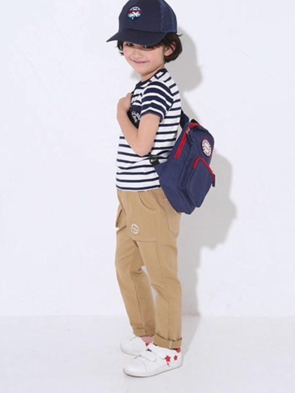【SLAPSLIP (スラップスリップ)】 定番のボーダーTシャツにロゴ入りの胸ポケットでアクセントを付けました。 立体感のある大きなポケットが目を引くテーパードパンツ。 ウエスト部分は伸縮性のある素材を使用し、肌あたりもやさしくストレスフリーな穿き心地◎ ◆ベベモールオフィシャルオンランストア◆ https://www.bebe-mall.jp/
