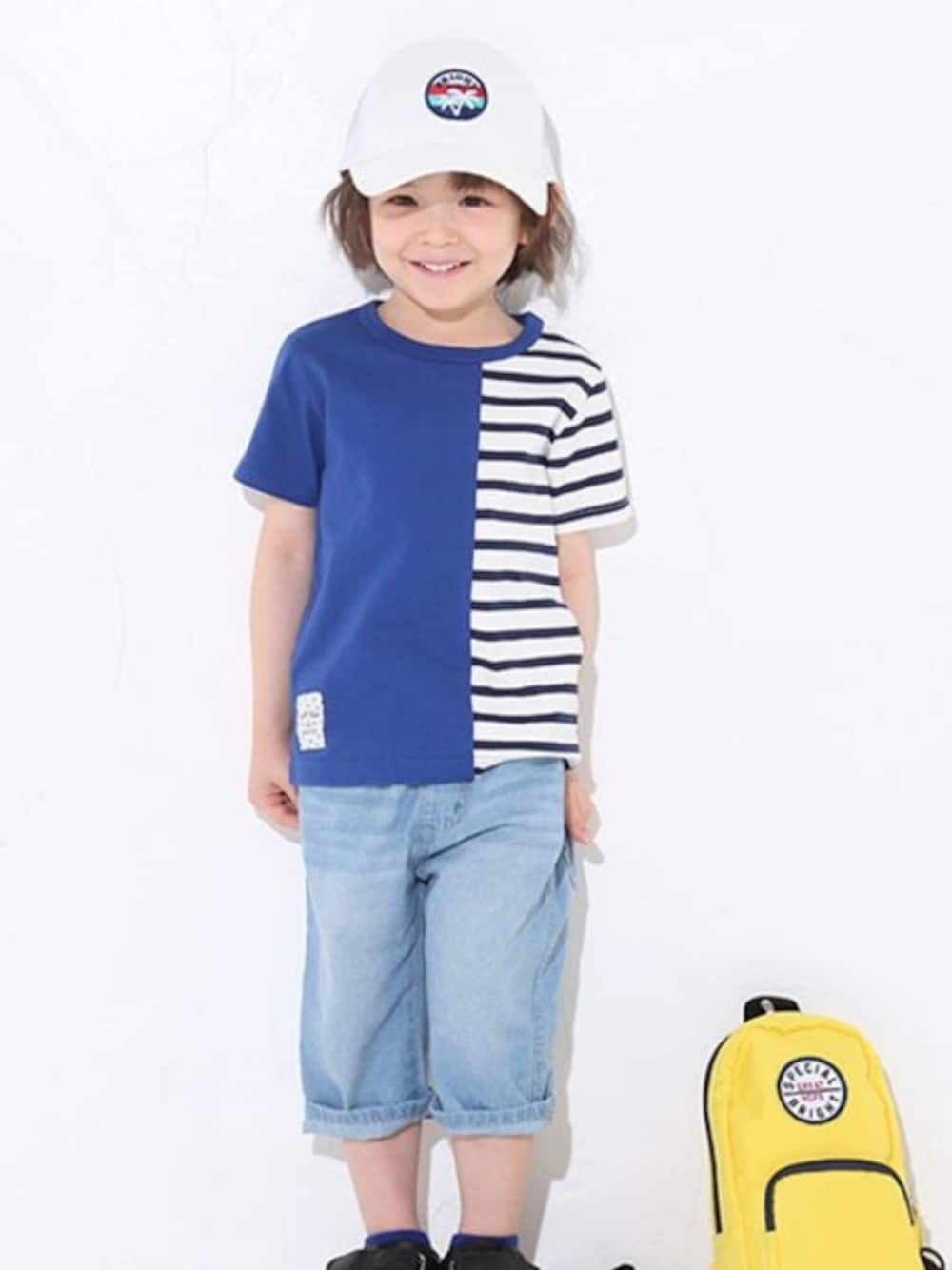 【SLAPSLIP (スラップスリップ)】 無地×ボーダー柄を大胆に切り替えたデザインがおしゃれなTシャツ。 ブランドロゴ入りのネームもさりげないアクセント。 軽い着心地のライトオンスデニムを使用した6分丈パンツ。 程よい色落ち加工が着こなしをこなれた雰囲気に仕上げてくれます。 ◆ベベモールオフィシャルオンランストア◆ https://www.bebe-mall.jp/