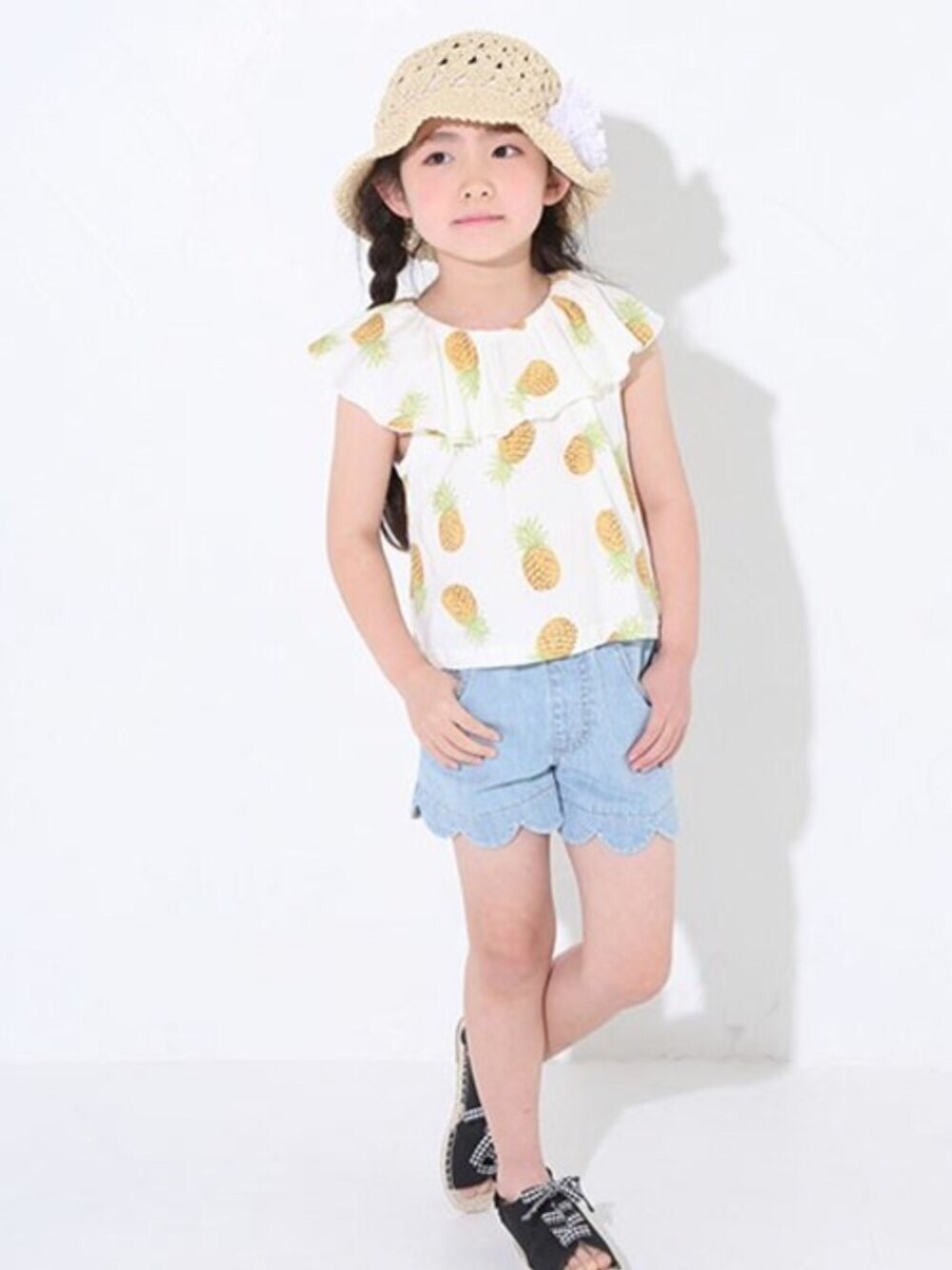 【SLAP SLIP (スラップスリップ)】 インパクトたっぷりのプリントが、元気いっぱいのお子様にピッタリのトップス。 フリル使いがガーリーなアイテムです。 スカラップカットを施した裾がcuteなデニムショートパンツ。 ◆ベベモールオフィシャルオンランストア◆ https://www.bebe-mall.jp/