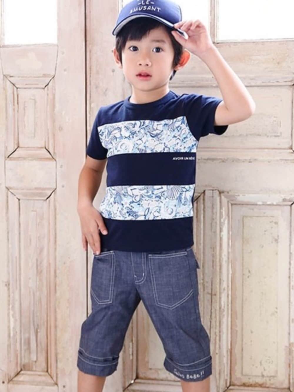 【BeBe (ベベ)】 海をイメージさせる爽やかなプリント使いが目を引くTシャツ。 大人びた上品なプリントがカジュアルスタイルを品よく仕上げてくれるポイントです。 7分丈パンツはナチュラルな上品さが魅力のシャンブレー生地を使用。