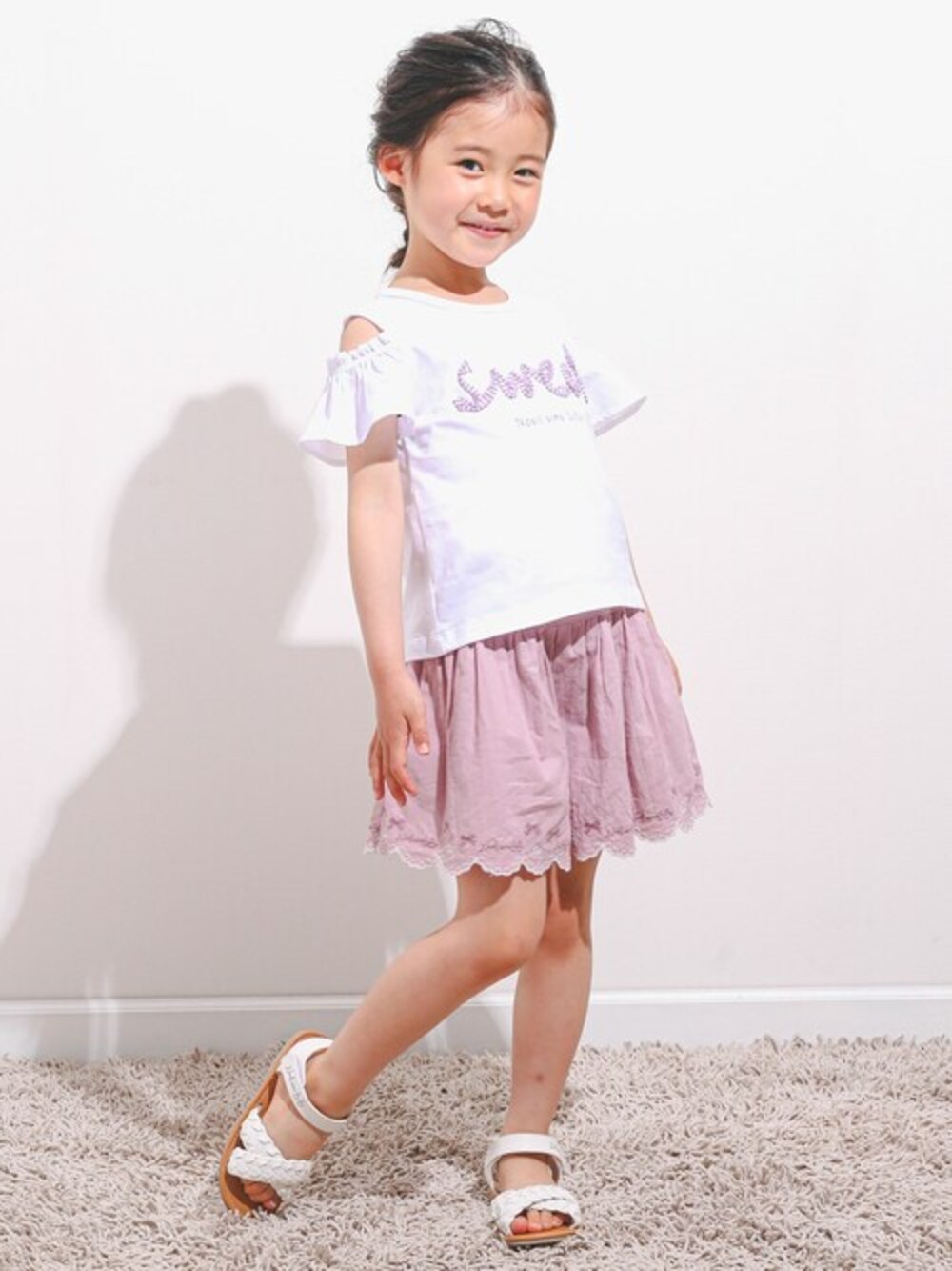 BEBE ONLINE STORE(BEBE ONLINE STORE)のTシャツ/カットソー「天竺 プリント 刺繍 肩開き Tシャツ (90~130cm)」を使ったコーディネート