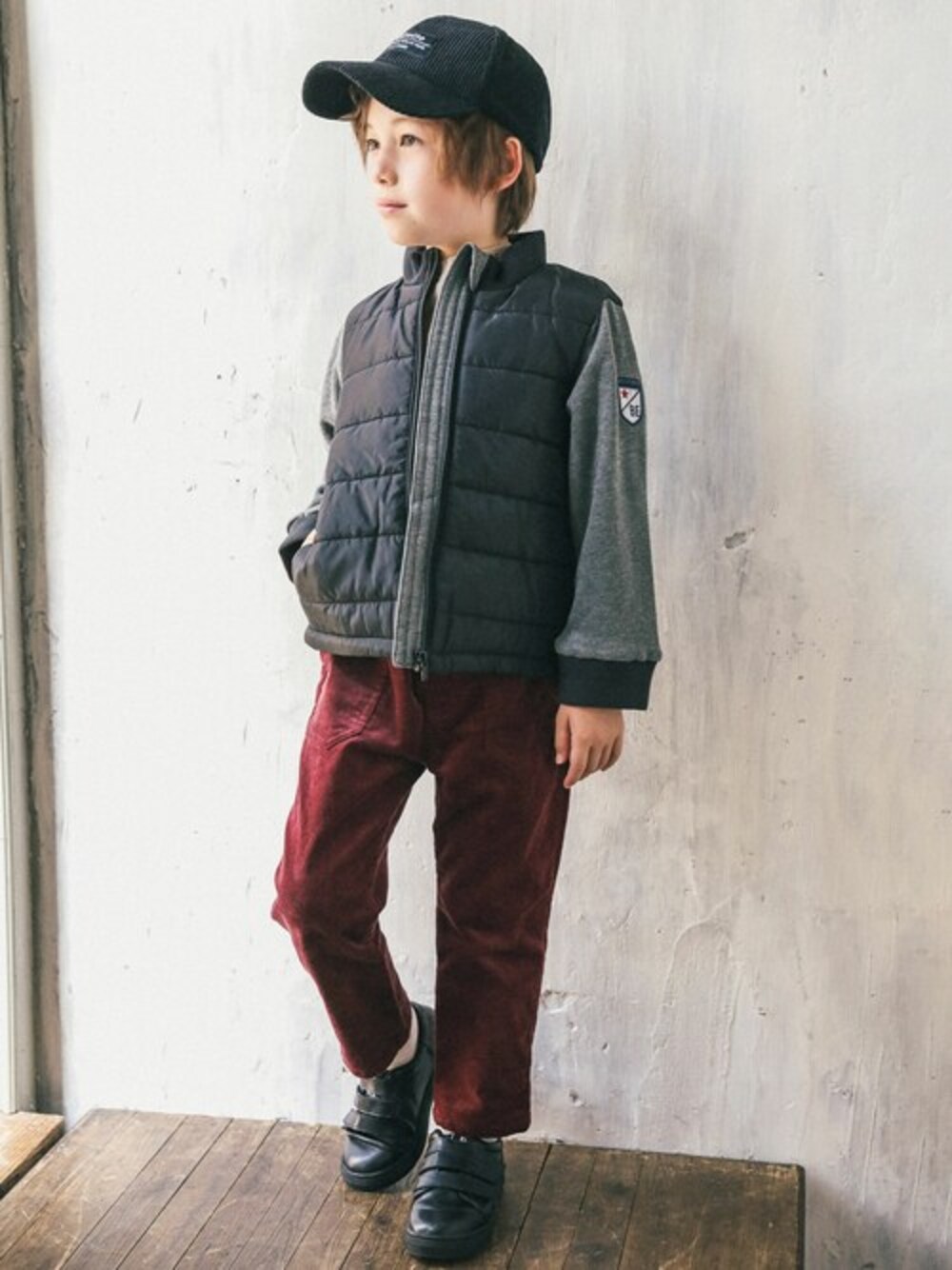 中綿ベストにスウェットのお袖がドッキングしたアウターは、普段使いに大活躍な1着! 袖や襟はリブで風を通しにくく、元気に外で遊びたい男の子にもピッタリ。 ボルドーのボトムがカジュアルな中にもシックな表情をプラスしてくれます。 【BeBe(べべ)】 ”LOVE MODERN” 少しおませで、生意気なヨーロピアンカジュアルの提案。 時代性・流行性をとらえ、ベーシックでもワンポイントを施した遊び心、楽しさを盛り込んでいます。 シンプルだけど、こだわりのあるオリジナリティーを重視しています。